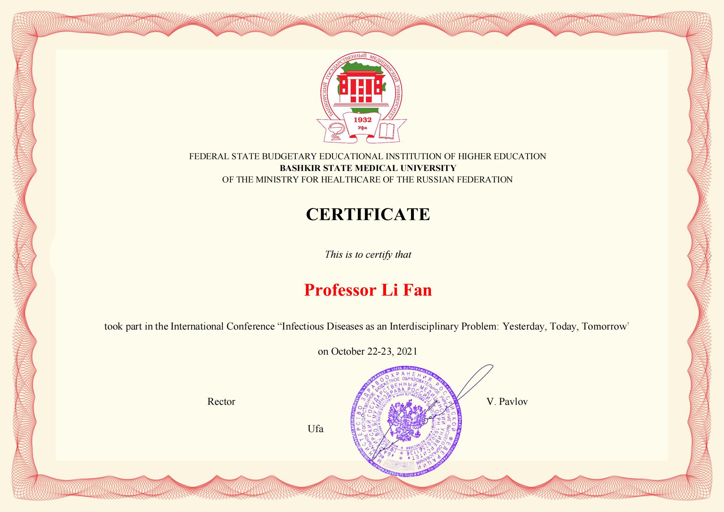 On October 22, 2021, Prof. Li Fan and Prof. Wang Fang from the College of Basic Medical Sciences were invited to attend an international academic seminar on“Infectious Diseases as an Interdisciplinary Problem: Yesterday, Today and Tomorrow”hosted by Bashkir State Medical University, Russia. More than 300 medical experts and scientists from Russia, Germany and China participated online. Professor Li Fan delivered a speech at the opening ceremony, expressing the hope that through this conference, participating universities and organizations will deepen and further cooperation in health emergency response, prevention and control of infectious and chronic diseases, etc.,strengthen mechanisms for information sharing, detection, joint prevention and control, and response to major infectious diseases, enhance coordination and cooperation in response to health emergencies and safeguard regional health security. Professor Fang Wang presented a report online entitled “Therole of cytokine storms in COVID-19”. Relating to the cutting-edge knowledge of medical microbiology and immunology, he explained the occurrence and development of COVID-19. As the pandemic continues to rage around the world, a better understanding of it based on research findings from around the world will be of great help in combating the pandemic. The conference also provided a systematic presentation of emerging and re-emerging infectious diseases around the world. Professor Pavlov Valentin Nikolaevich, President of Bashkir State Medical University and Academician Yang Baofeng of Harbin Medical University attended the conference.