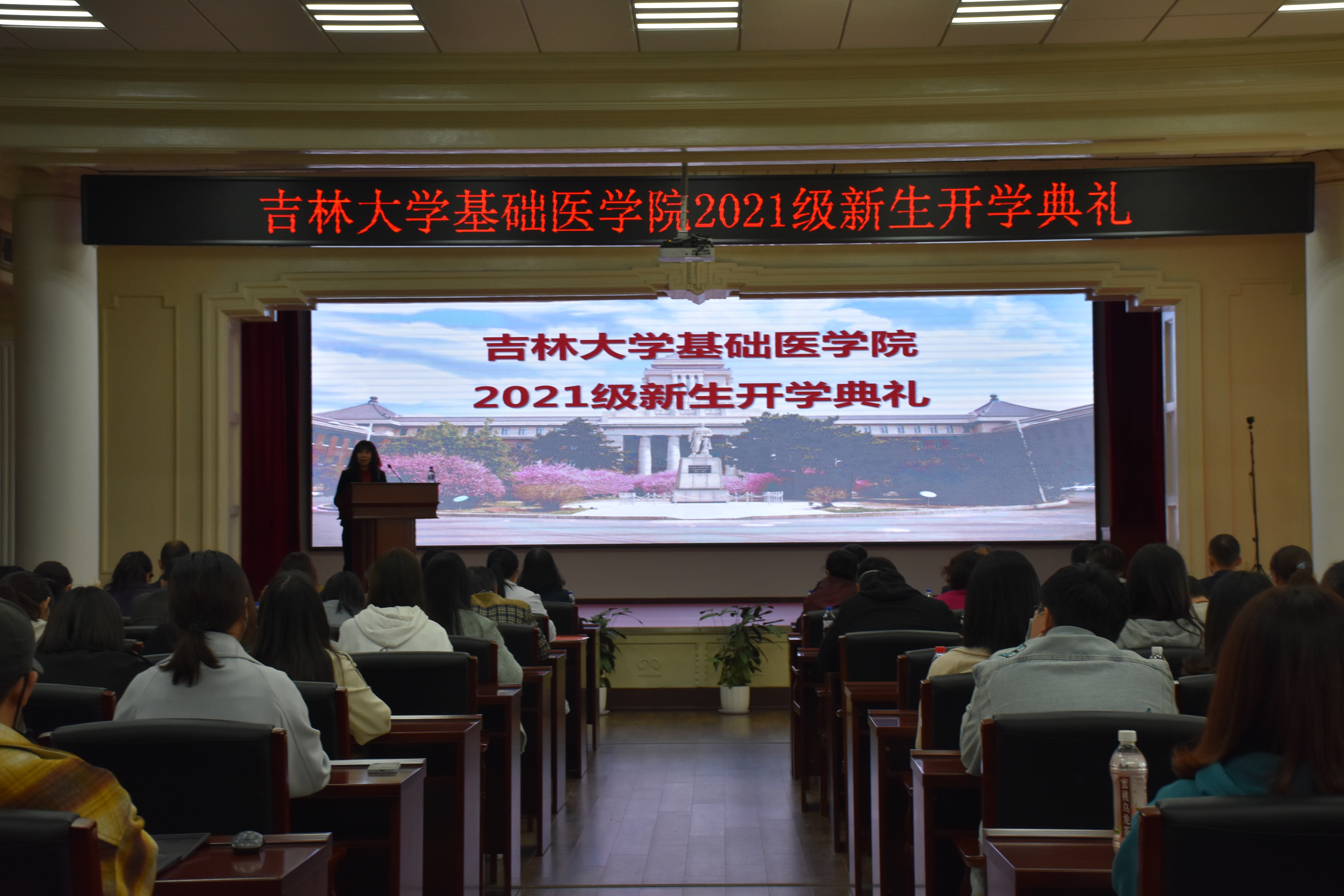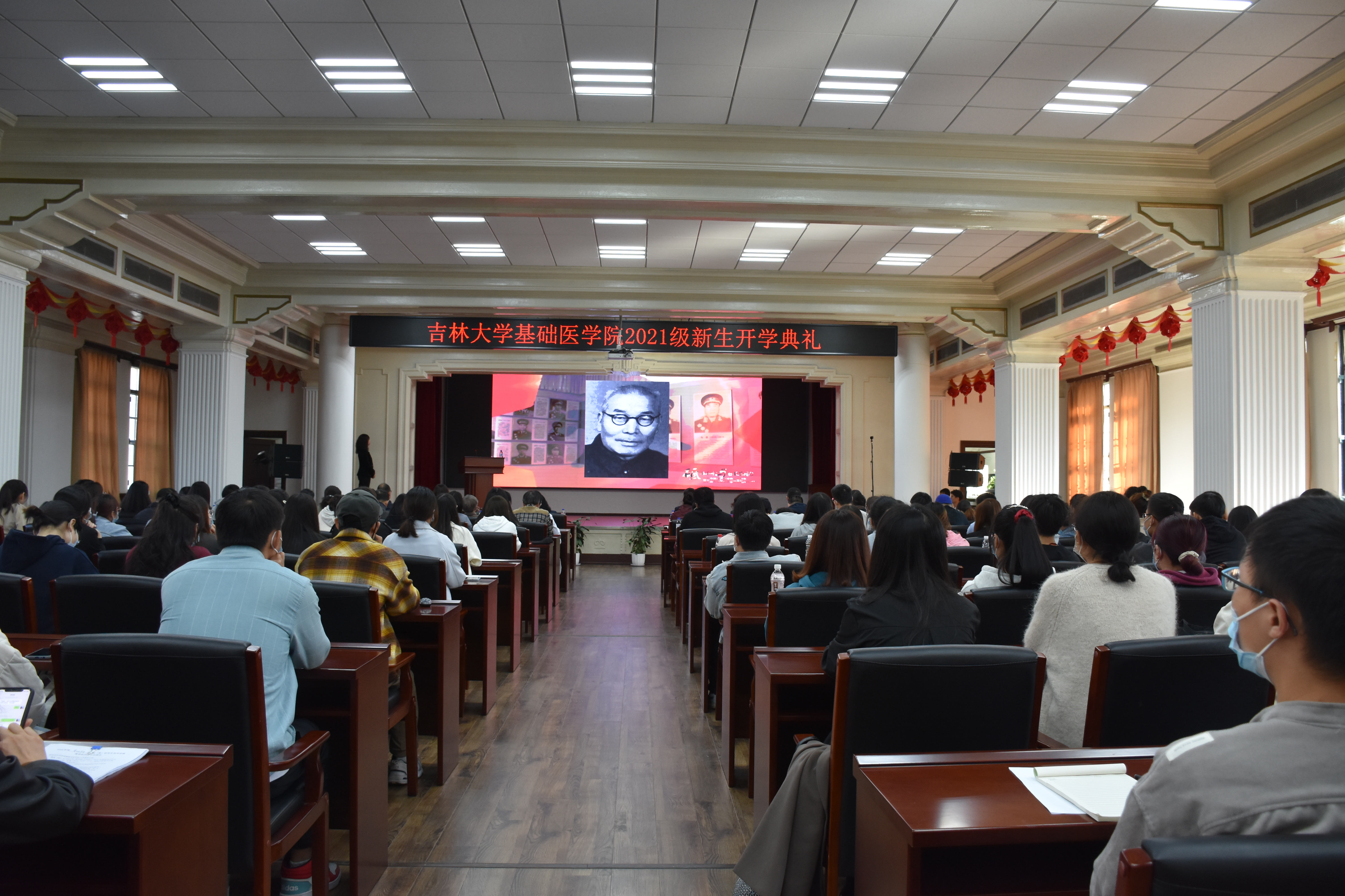 院长王放,党委书记王晓荣,副书记曹国丽,副院长李洪岩,副院长刘海岩,副院长辛颖,副院长孙巍,副院长陈龙,各学系(科室)中层管理干部,研究生指导教师及2021级全体新生出席会议。开学典礼由副书记曹国丽主持。