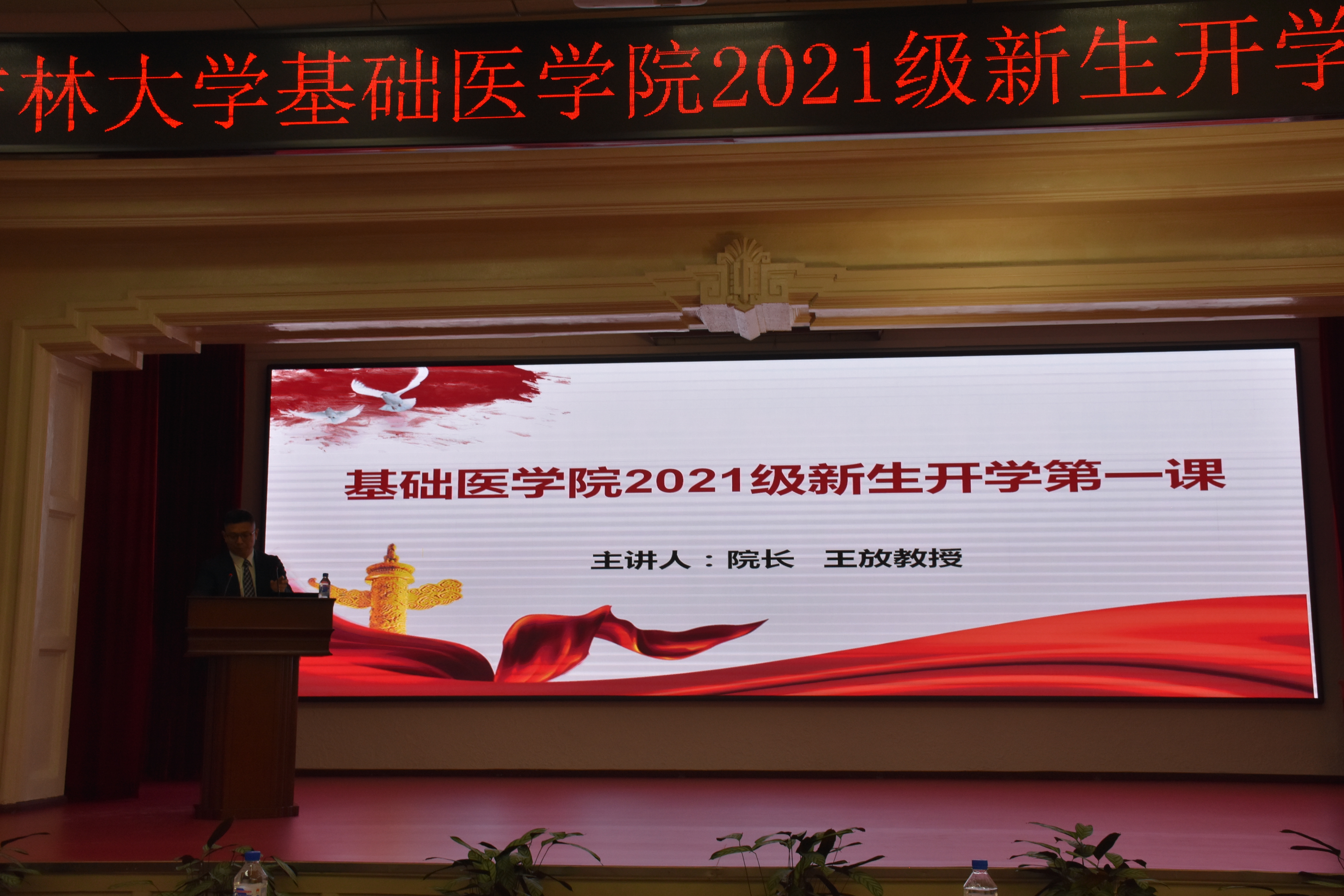 优质资源、砥砺拼搏、成为有传承、有担当、有情怀的基础人。随后,王院长为全体新生讲授了“开学第一课”,鼓励大家应以本届诺贝尔生理学或医学奖获奖的两位科学家大卫·朱利叶斯和阿登·帕塔普蒂安为榜样,在基础医学领域深海探索,以为人类发展做贡献为己任。在学习和科研的同时要肩负民族使命,做到诚实正直,博学笃志。王放院长对同学们提出殷殷期望:一是要将被动学习转变为主动学习,阅读文献,学习实验技术;二是在专业上要以兴趣为导向,多于导师沟通,做自己喜欢的科研;三是永葆创新精神,做到学科交叉,学术创新;四是敢于质疑,善于思考,永远满含好奇心;五是强健体魄,内外兼修。王院长饱含深情的第一课,更是一次精彩生动的党课,他多次强调并叮嘱同学们勿忘国耻,居安思危,要坚定理想信念,厚植家国情怀,肩负使命担当,砥砺拼搏奋进,努力成为堪当民族复兴重任的时代新人,为实现伟大复兴与祖国统一而努力奋斗。