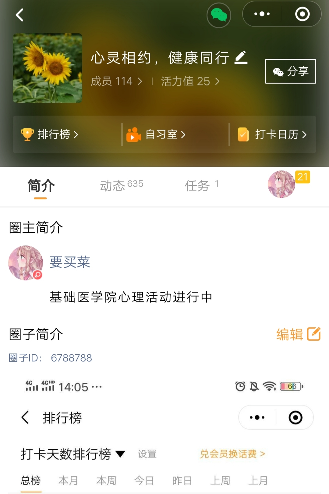 采用线上微信小程序打卡方式举办了2021年“朋辈协力•心理成长”系列活动—— “心灵相约,健康同行”运动互动打卡活动。本次活动由研究生心理辅导员孙佳钰老师组织,朋辈心理辅导员赵鹤负责,全院研究生共同参加。