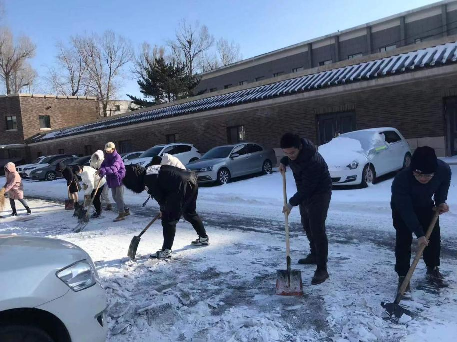 组织研究生清扫院内积雪,清雪活动得到了全体同学的积极响应,大家有序分工,相互配合,共同克服严寒天气,以饱满的热情和充足的干劲铲冰清雪,活动现场大家享受着劳动中的愉快欢欣,脸上都洋溢着灿烂的笑容。研究生团队充分发挥团队精神,齐心合力经过一下午的共同奋战,院内积雪基本清理干净。