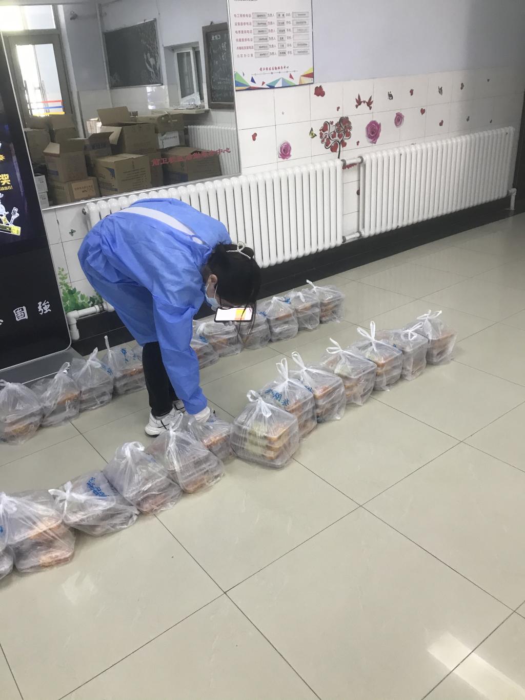 哪里最困难,党旗就在哪里。宿舍楼内没有电梯,物资搬运和发放很困难。党员志愿者毫不犹豫,勇敢地接过最艰辛的任务,坚守在宿舍楼门口搬运生活物资和防疫物资。每一份盒饭,每一瓶水,每一个口罩,每一份物资从卸车到发放到同学们手中,都是她们辛劳的付出。每个配餐箱、每箱防疫物资近百斤,男生搬起来都很费劲,志愿者队伍里有很多女同学,每天物资发放她们要负重爬楼十几趟,即便皮肤因消毒液频繁消杀而胀痛,身体因持续体力工作腰酸背痛,她们从没有抱怨和退缩过,始终战于一线。