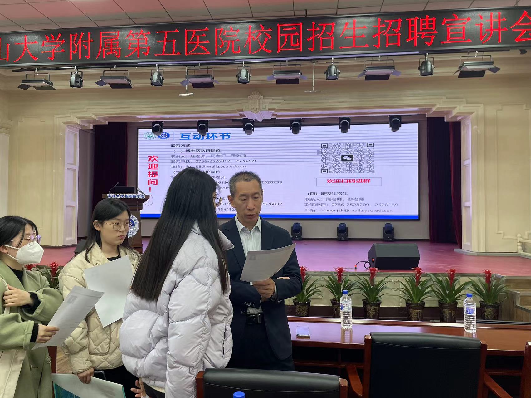 随后,中山大学附属第五医院口腔科李祥伟主任作为校友代表,上台详细介绍了中山市人才引进政策和医院的情况。招聘会结束后,同学们井然有序地投递出自己精心准备的简历并积极自信地与对方交流,中山大学附属第五医院的各位老师也耐心细致地解答了每位同学的提问。