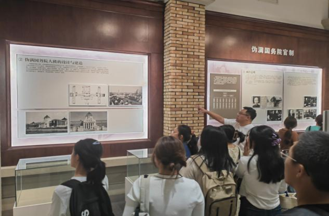 党委副书记李东洋、研究生辅导员孙佳钰的带领下,参观了基础楼五楼的爱国主义教育基地一一伪满洲国警示教育展览馆。这里陈列着伪满国务院大楼的设计与建造的简介、伪满国务院官制、伪满洲国重大历史事件简编、和日本战败递交投降书的人物模型。