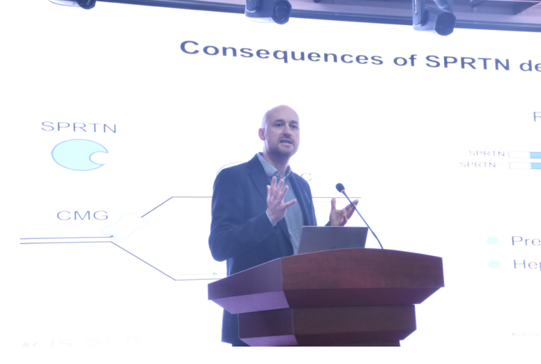 讲座内容深刻揭示了细胞应对两类关键生物大分子损伤——DNA-蛋白质交联(DPC)和RNA损伤——的精妙分子机制,充分展现了生物化学、结构生物学、细胞生物学与遗传学等多学科交叉融合在推动生命科学前沿研究中的强大动力。Stingele Julian教授聚焦于细胞如何修复DNA-蛋白质交联这一棘手问题。介绍了团队最新研究进展。不仅从生化层面深化了机制认知,也紧密联系人类健康。随后讲解了团队以化疗药物阿糖胞苷为模型,挑战了其仅通过DNA损伤起效的传统观点。研究团队描绘了一幅精彩的细胞“生死抉择”图景,为理解化疗药物机理及潜在联合治疗策略提供了全新视角。