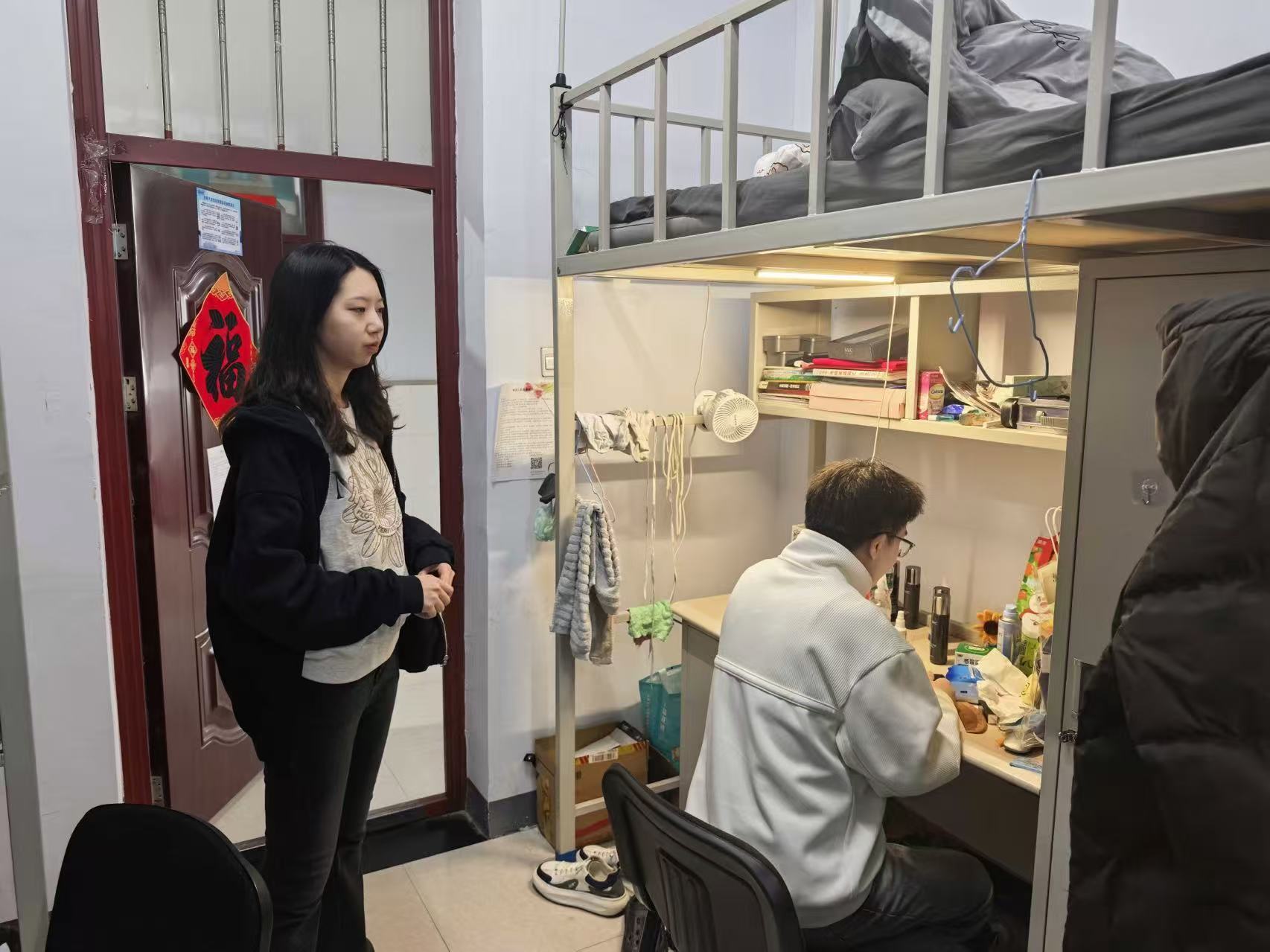 检查过程中,辅导员孙佳钰老师结合现场情况,与在场研究生进行了交流,详细了解同学们近期科研实验、生活状况及假期安排情况,并就研究生工作室和宿舍用电安全、环境卫生维护、公共空间规范使用等事项进行了提醒,引导同学们增强安全意识和规范意识,自觉维护良好的学习和生活环境。