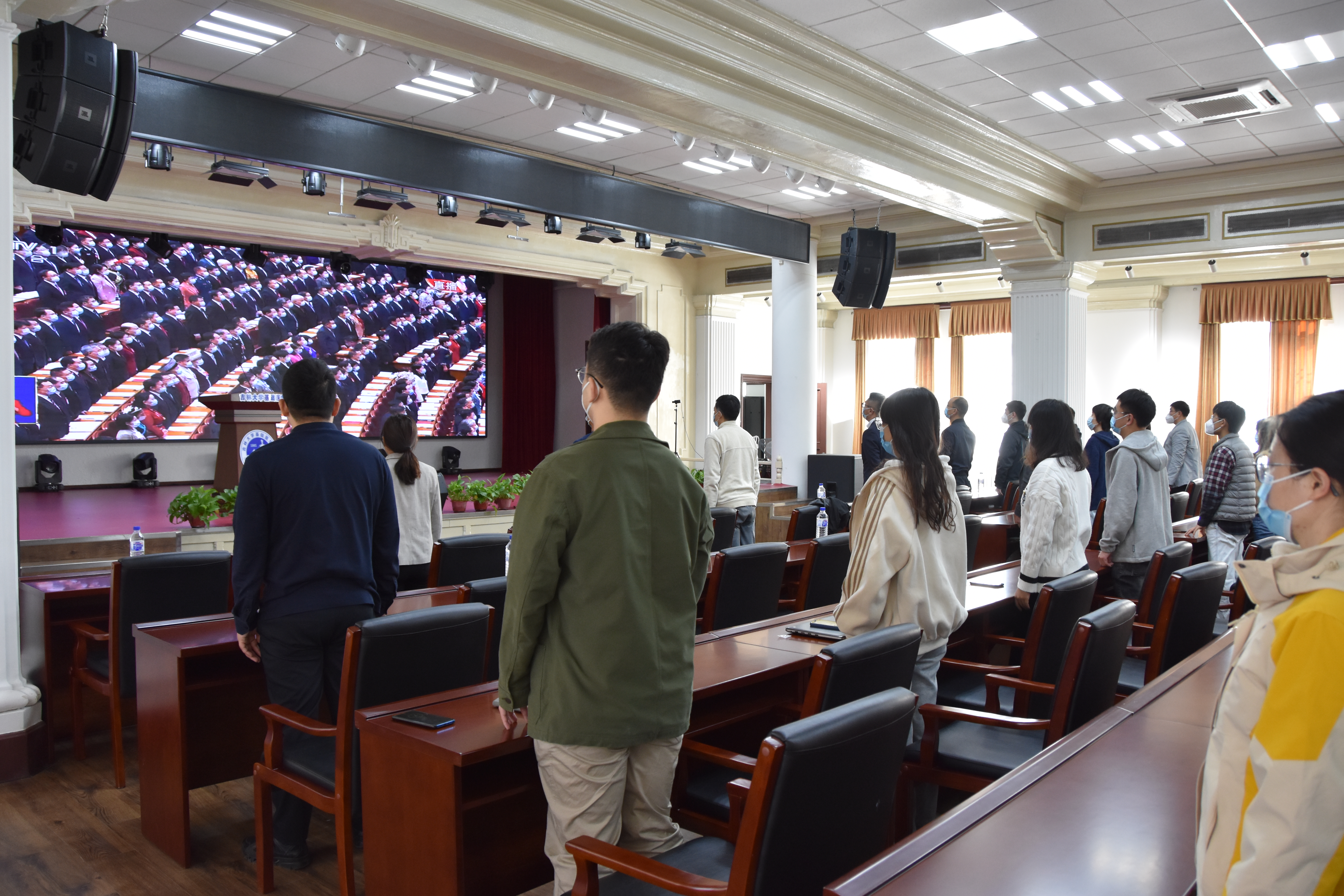 二楼报告厅集中观看中共二十大开幕会的电视直播。10时许,大家集体起立,齐唱国歌,为庄严的开幕式增添浓重热烈氛围。澳门六合彩资料库