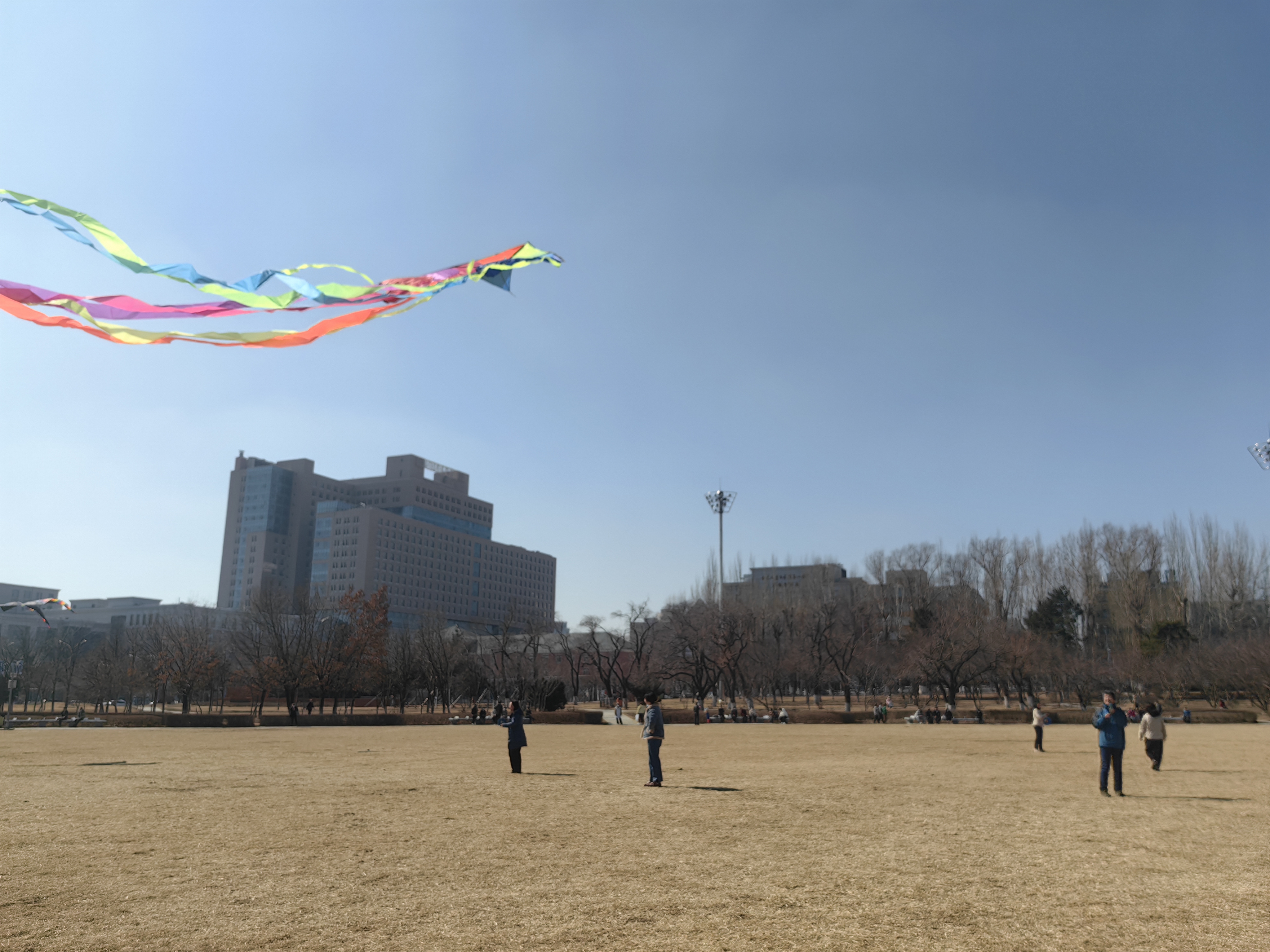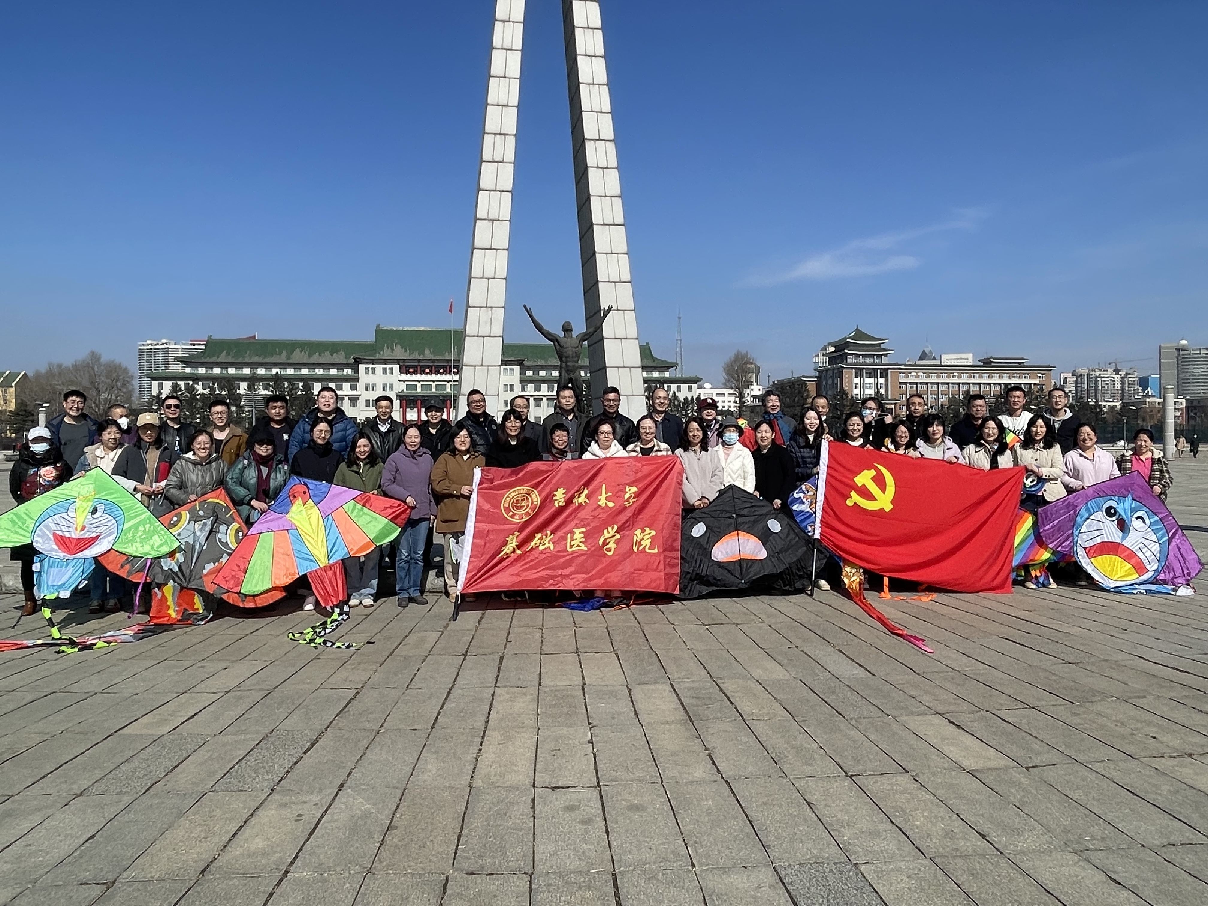 的女教职工们褪去了工作时的严谨形象,脸上洋溢着热情、活力与朝气,各式各样、色彩纷飞的风筝满载着教职工们的希望与快乐在天空中自由翱翔。