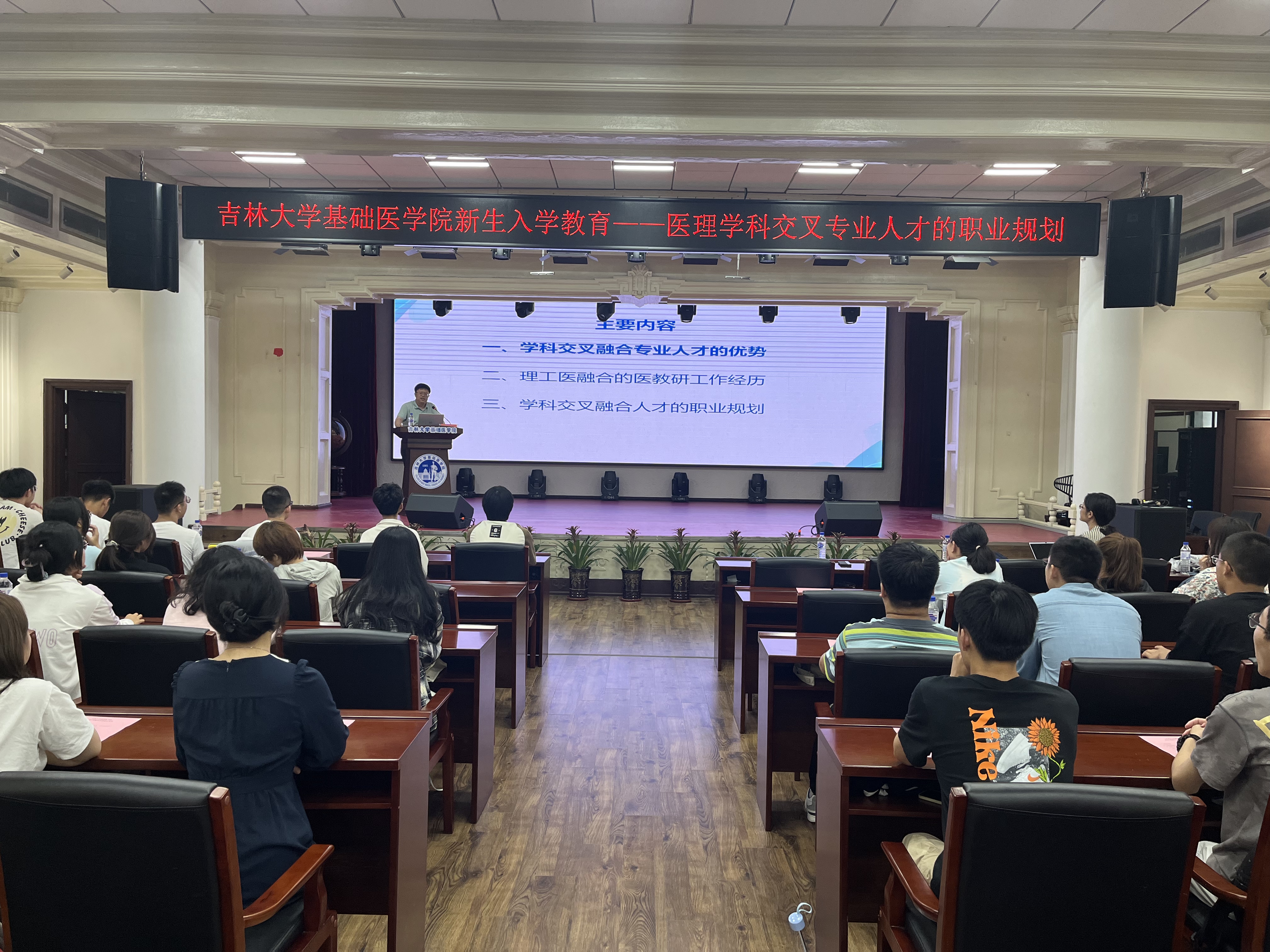 中日联谊医院影像工程中心主任刘景鑫教授为2023级全体本科生开展“医理学科交叉专业学习生涯规划”的专题讲座。