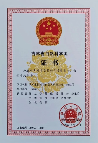 陈立教授、李晶教授、张明教授团队“纳米生物材料在重大疾病治疗中的应用”研究荣获2023年度吉林省自然科学一等奖。团队10多年来一直深耕于纳米医学、药学的交叉领域,开发性能优异的纳米材料用于重大疾病的诊断与治疗,通过示踪药物递送、靶向可控释药及精准调控疾病微环境,成功地提高了肿瘤等重大疾病综合治疗的可视化、有效性和安全性,长期的科研积累取得了系列的原创研究进展。参评的5篇代表性论文累计IF=67.821,WOS总引267次,他引202次。被Chemical Reviews(IF=72.087),Nature Nanotechnology(IF= 40.532)等高水平刊物引用。与本项目相关的研究成果获得国家自然科学基金面上项目2项、国家发明专利1项。这些工作为纳米材料在医药学领域的应用提供了重要的理论参考和借鉴,受到了国内外同行的广泛关注和认可。