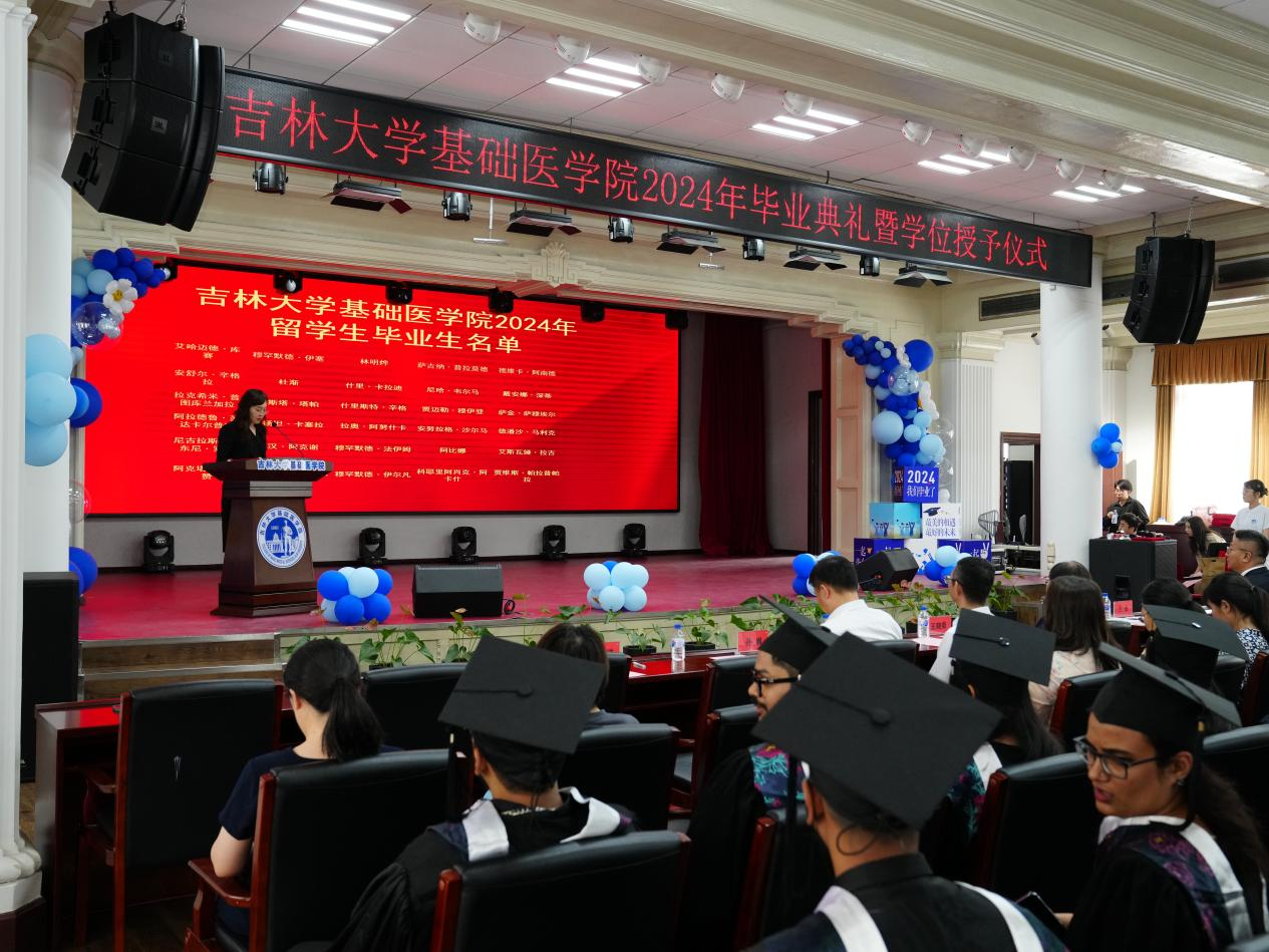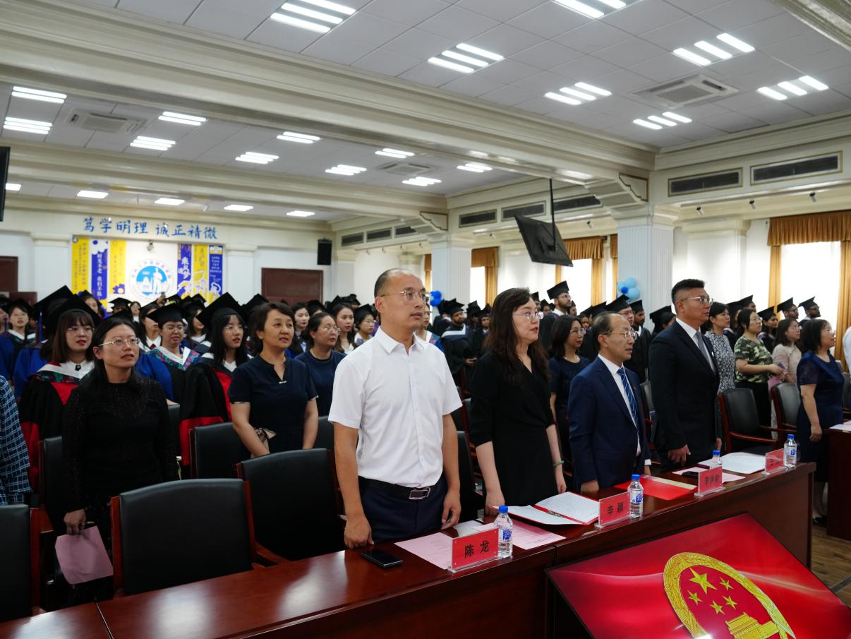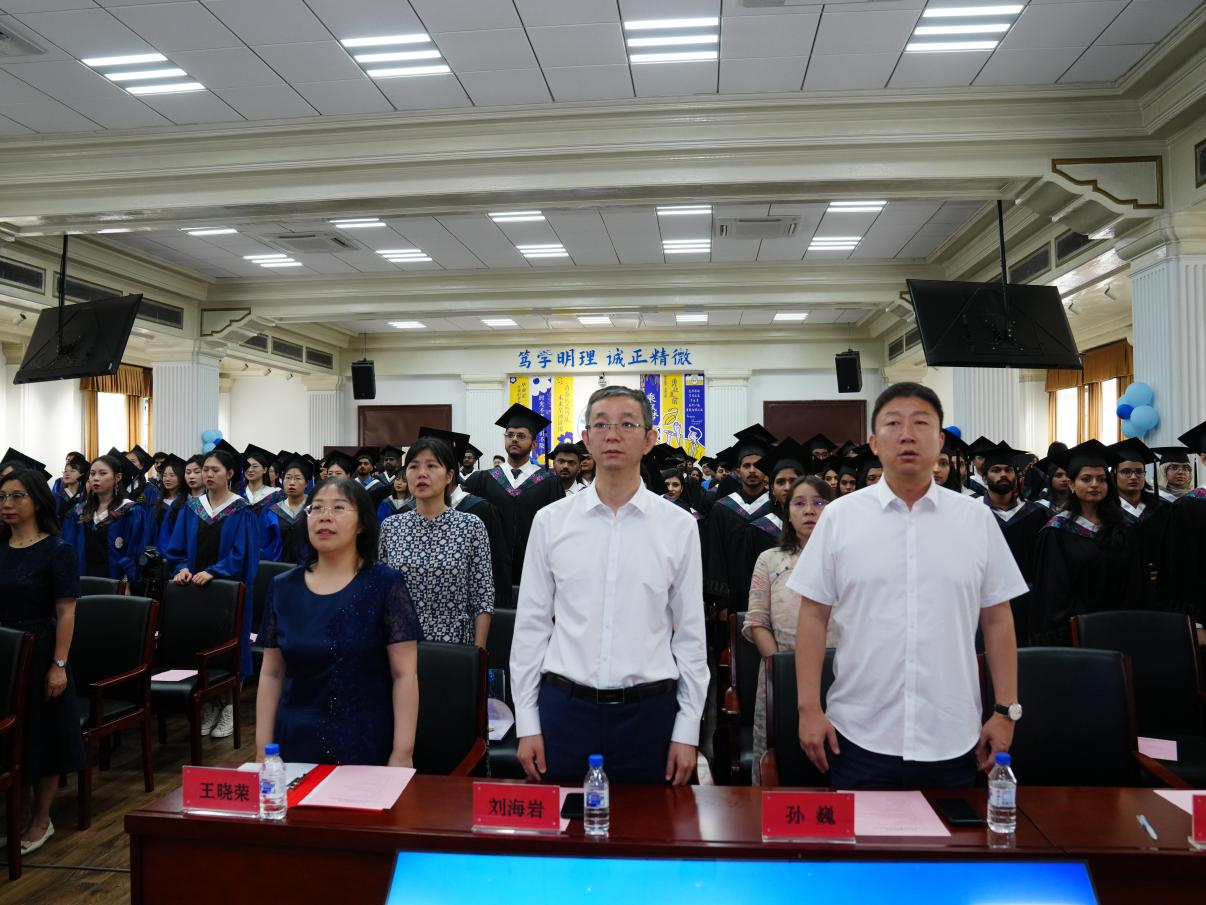 毕业典礼在激昂的国歌声中拉开序幕,由副院长辛颖教授宣读留学生毕业生名单。