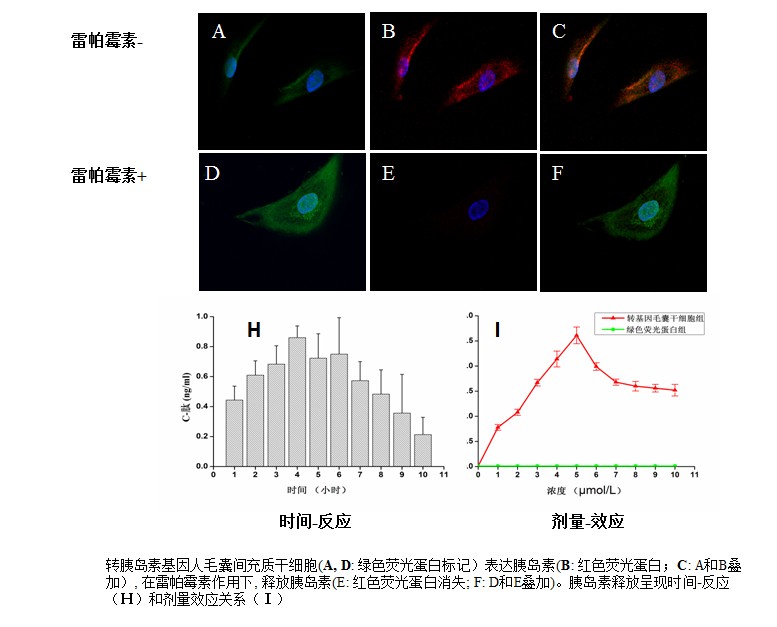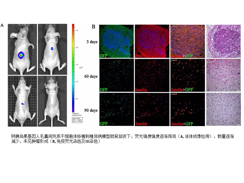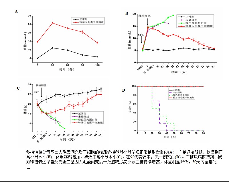 病理生物学教育部重点实验室研究人员利用慢病毒载体,将靶向可控的人胰岛素基因转导到人毛囊间充质干细胞中。这种转基因的人毛囊间充质干细胞持续表达胰岛素,但不释放胰岛素。只有在外来药物-雷帕霉素作用下,胰岛素才从细胞内释放出来。这种转基因人毛囊间充质干细胞移植到糖尿病模型小鼠体内,在雷帕霉素作用下,释放胰岛素,逆转糖尿病鼠高血糖,恢复糖尿病鼠体重。移植这种转胰岛素基因毛囊间充质干细胞的糖尿病鼠在长达90天的试验中无一例死亡,而糖尿病模型组或移植转绿色荧光蛋白基因毛囊间充质干细胞的糖尿病鼠(对照组),在糖尿病模型建立后20天开始死亡,35天内全部死亡。该研究内容发表在“Cell Transplantation”2014 May 15. [Epub ahead of print]。