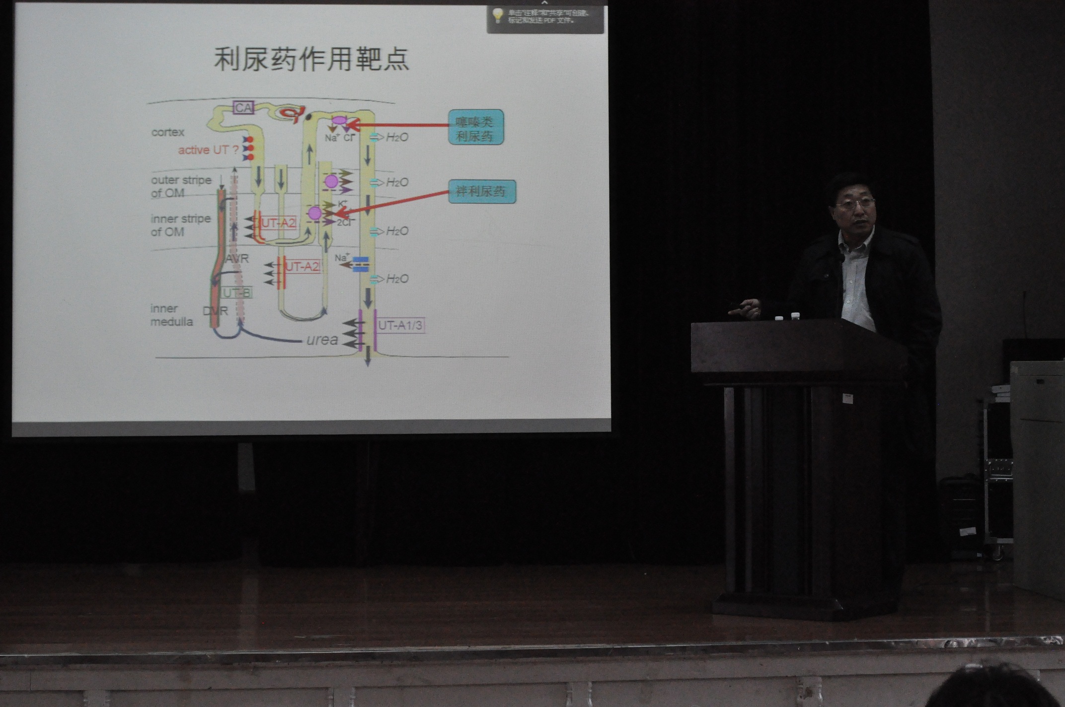 来自美国加州大学旧金山分校的杨宝学教授以“新型利尿药的发现”为题,从肾脏的解剖结构、渗透压梯度的形成机制及其对尿生成的影响入手,介绍了常用利尿药的作用特点及主要不良反应。进而谈及尿素通道蛋白在尿生成过程中的重要作用,并结合自己的科研工作,介绍了尿通道蛋白抑制剂的发现过程及作为新型利尿剂的可能性。