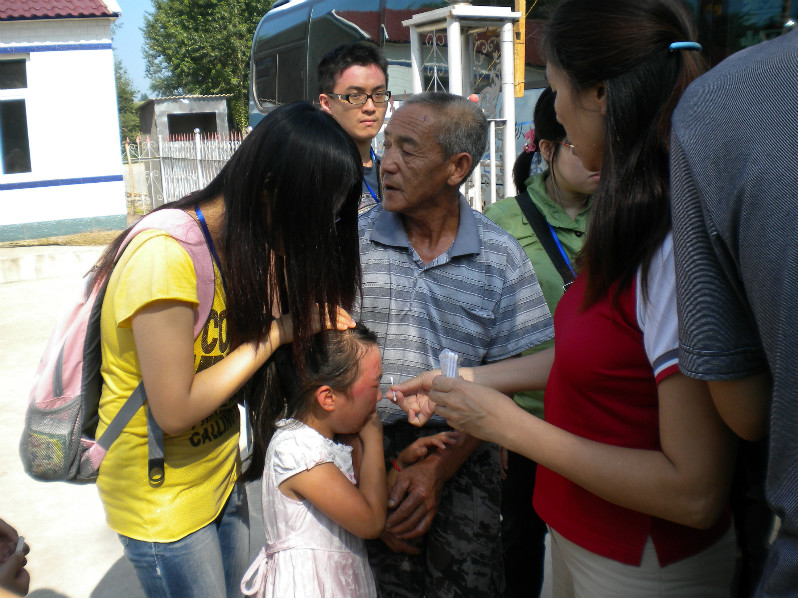 出发前,一个前一天脸部擦破的小姑娘在爷爷的带领下找到我们,简单包扎的伤口中有很多液体渗出,我们告诉她夏季炎热,擦破的伤口消毒后尽量开放式处置,做多年护理工作的廖老师因为担心碘酒的色素在小姑娘的脸上留下疤痕,所以交代我们用酒精为她消了毒,又涂上了台湾师生带来的药膏,消毒时很疼很疼,小姑娘疼哭了,但她始终坚持没有退缩,内心里充满了对我们的信任。一个阿姨也来让我们看看她的甲状腺的问题,刚刚在甲状腺外科实习过的姚立宇同学细心的为这个阿姨进行了触诊、问诊等检查,发现甲状腺多发结节存在,所以建议她到医院进一步诊治。接着一个奶奶为她妹妹的皮肤病问题也来咨询。