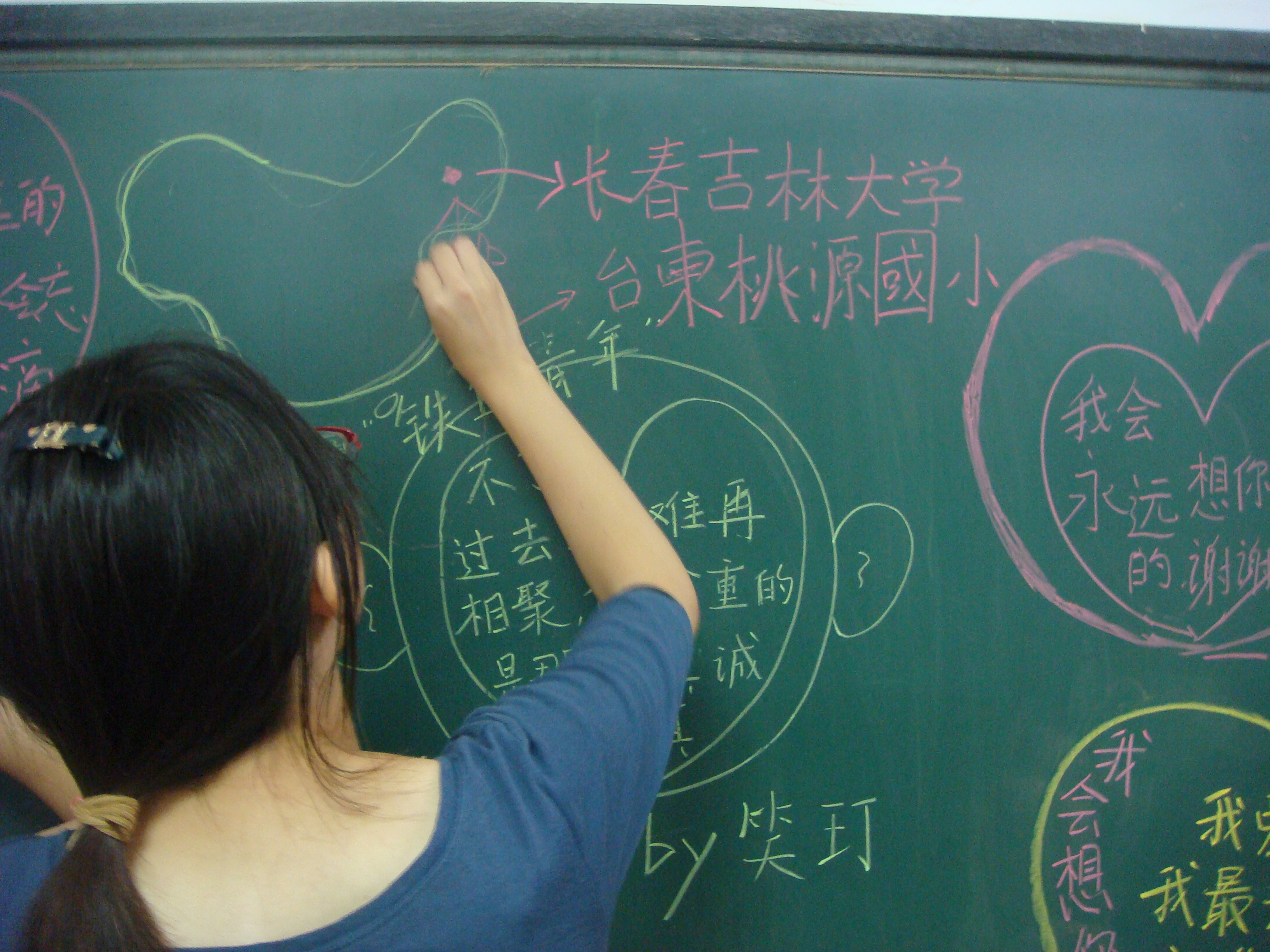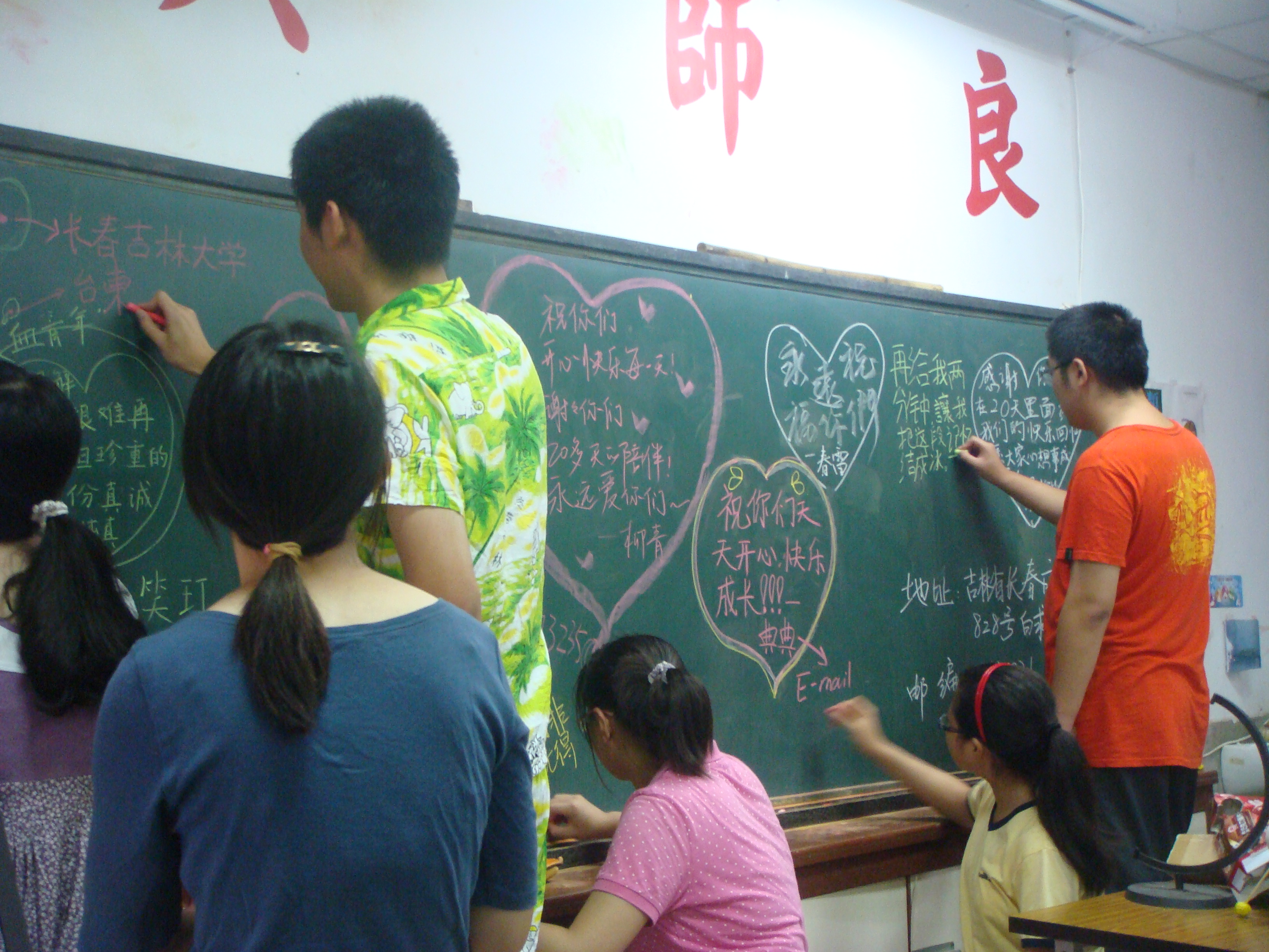 的学生都送来一封信——与其说是信,不如说是纸条——信中画满了“心”,写满了“爱”,其中一个顽皮的孩子还和我们带队的苑锐副书记说,请他把长的最帅的“绅宇哥哥”和“霁航哥哥”留下来。我们,也同样将对他们的思念画满了整整一个黑板。
