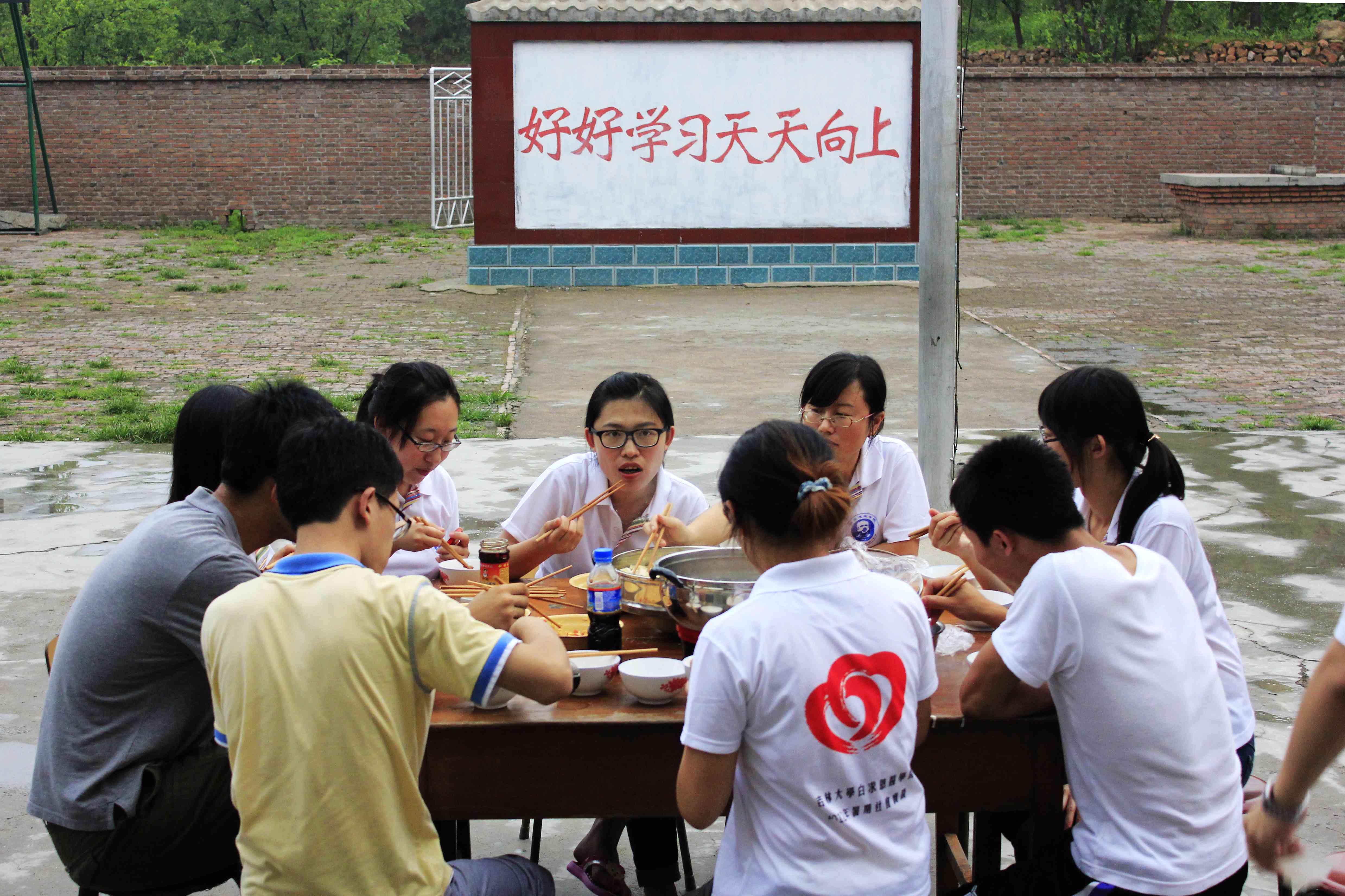 校园虽小,但很整洁。校长早早地在白色的教学楼前迎接我们。因为条件有限,所有的队员都在地上打地铺,每日的三餐也要队员们自己动手准备。天气很热,蚊虫很多,但队员们仍坚持着克服种种困难,迎接接下来的几天社会实践。