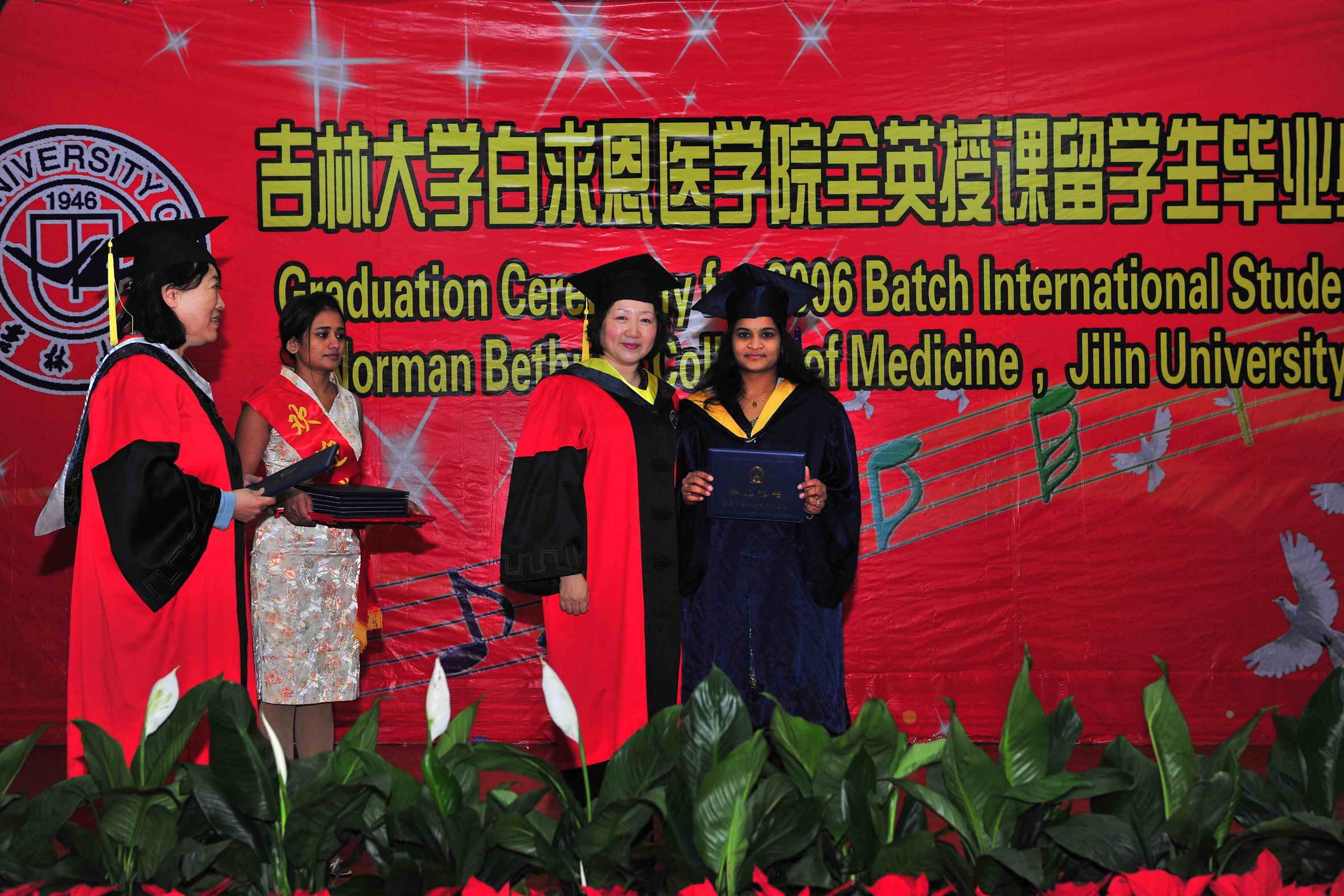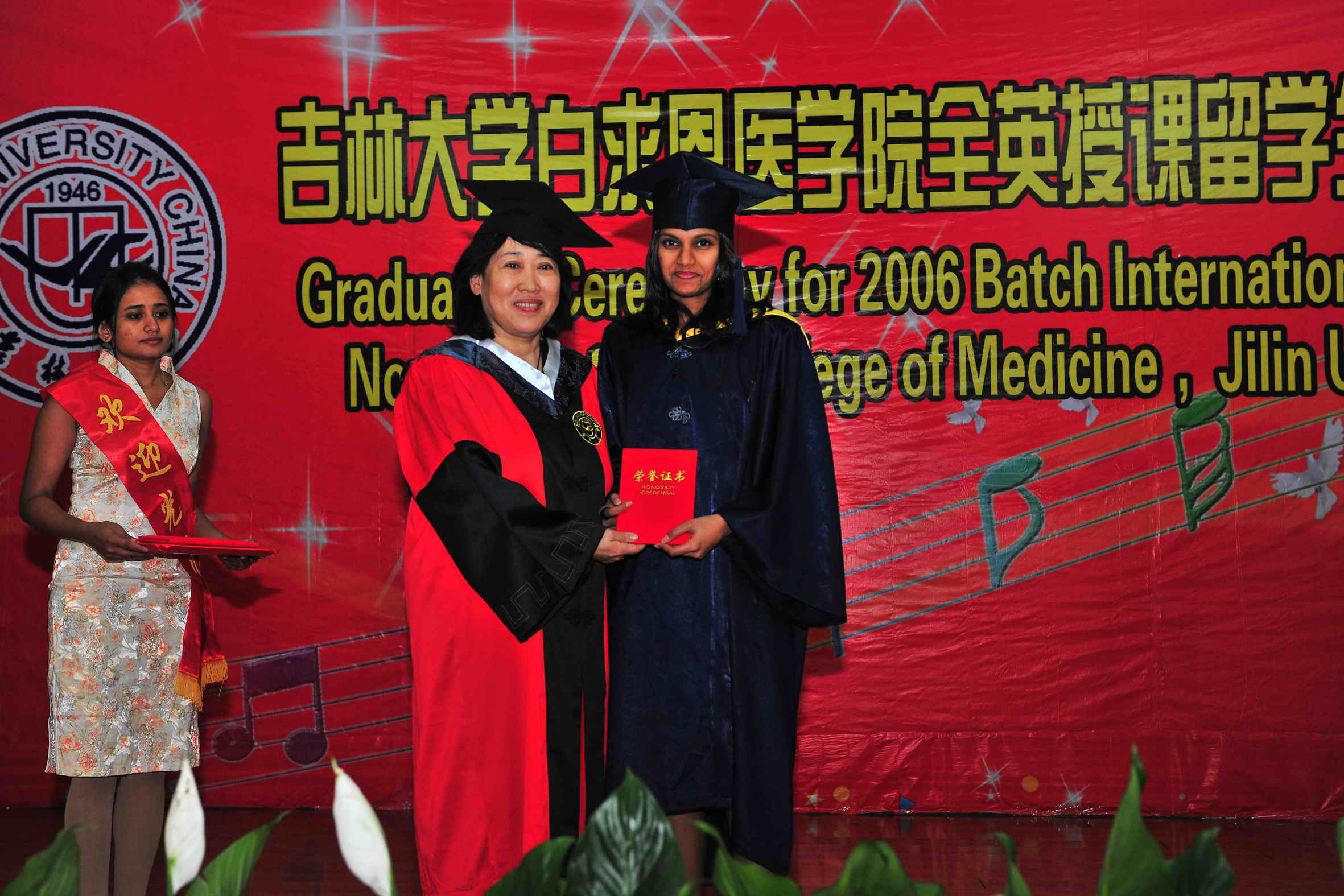 常务副院长孙连坤宣布了关于授予77名留学生医学学士学位和表彰3名优秀毕业生的决定。蔡莉为安娜等77名留学生颁发了毕业证书;李凡为3名留学生颁发了优秀毕业生证书。