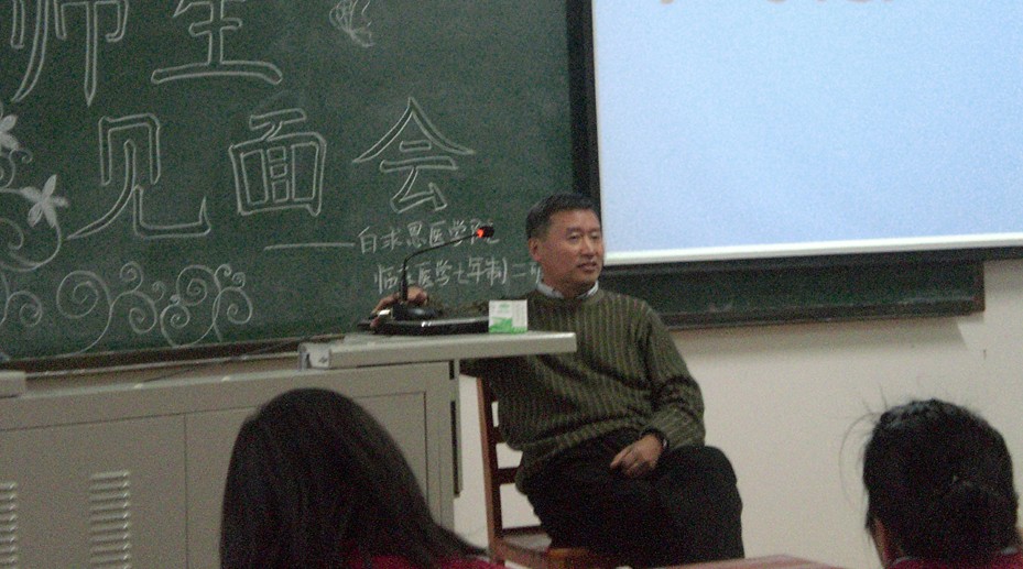 在见面会上,首先由班长耿任进行了班主任介绍及班级介绍,以此增进杨教授与同学间的相互了解,拉近了师生间的距离。随后,杨教授简要介绍了自身经历、工作状况以及目前的专业研究方向,并就亲身体验讲述了中美医学教育体制的差别。杨教授亲切随和、诙谐幽默,与同学们建立了轻松、和谐、平等的关系。