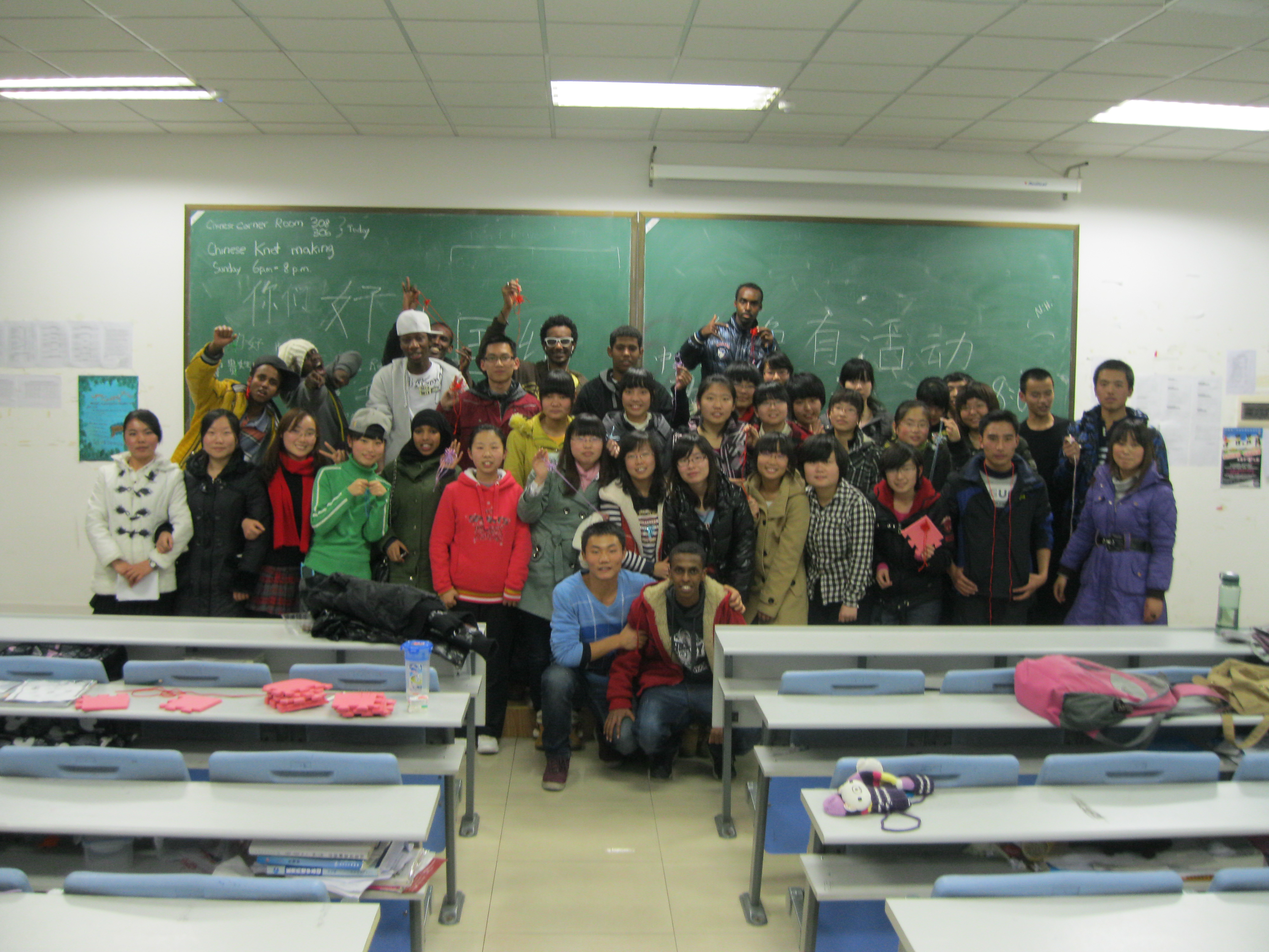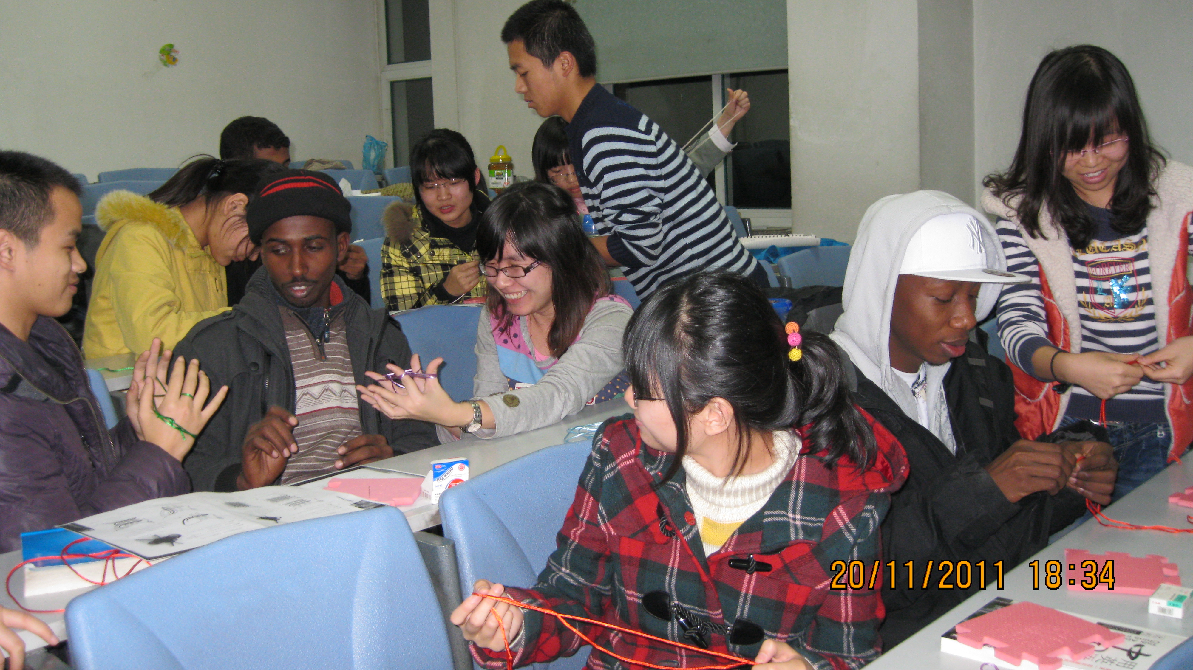 留学生办公室、阳光志愿者协会项目部和“千千情结”编织协会共同在新民校区第二教学楼2204教室举办了“交织友情—中外学生共编中国结”活动,30余名学生参加了此次活动。