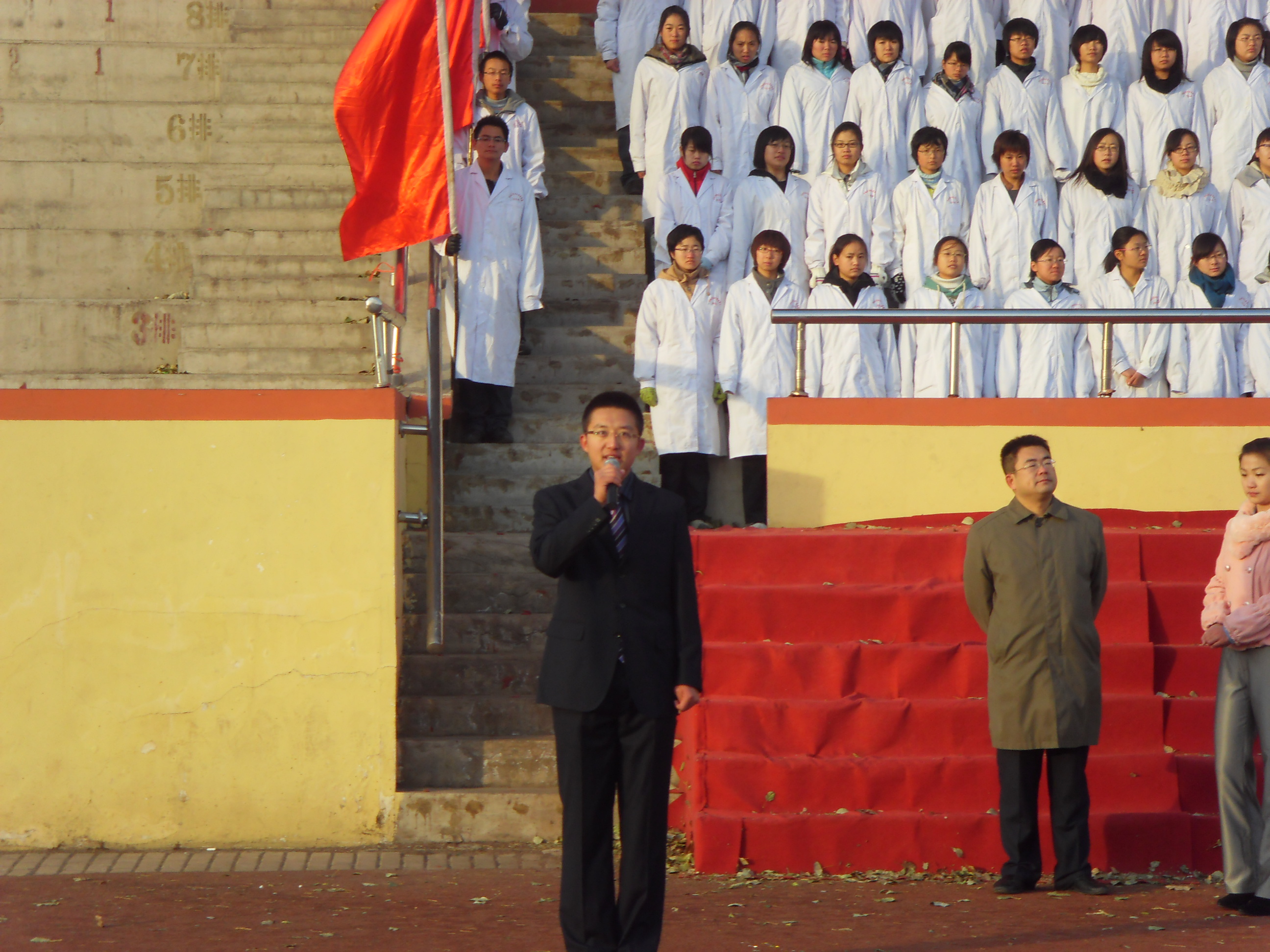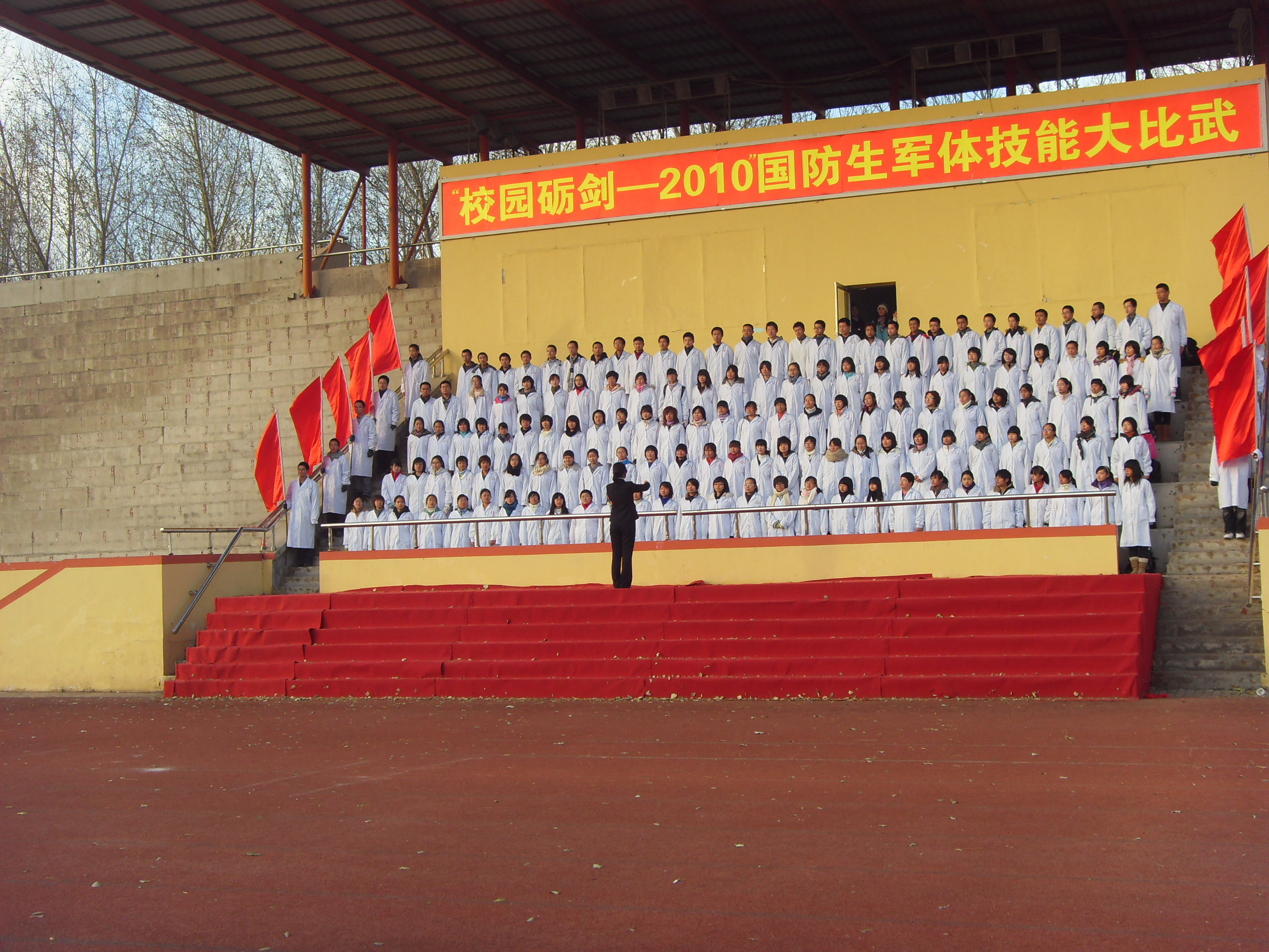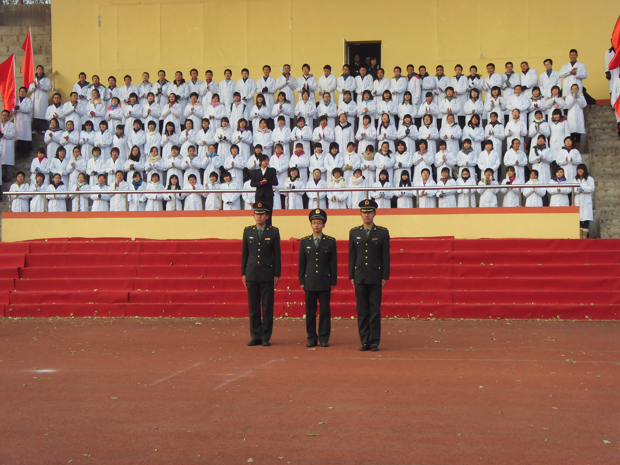 2010级长学制所有女同学则身着一袭白衣,以准医生的身份立誓为国家效力,并以一首响亮的《红旗飘飘》表达了对红旗的热爱、对祖国的赤诚。