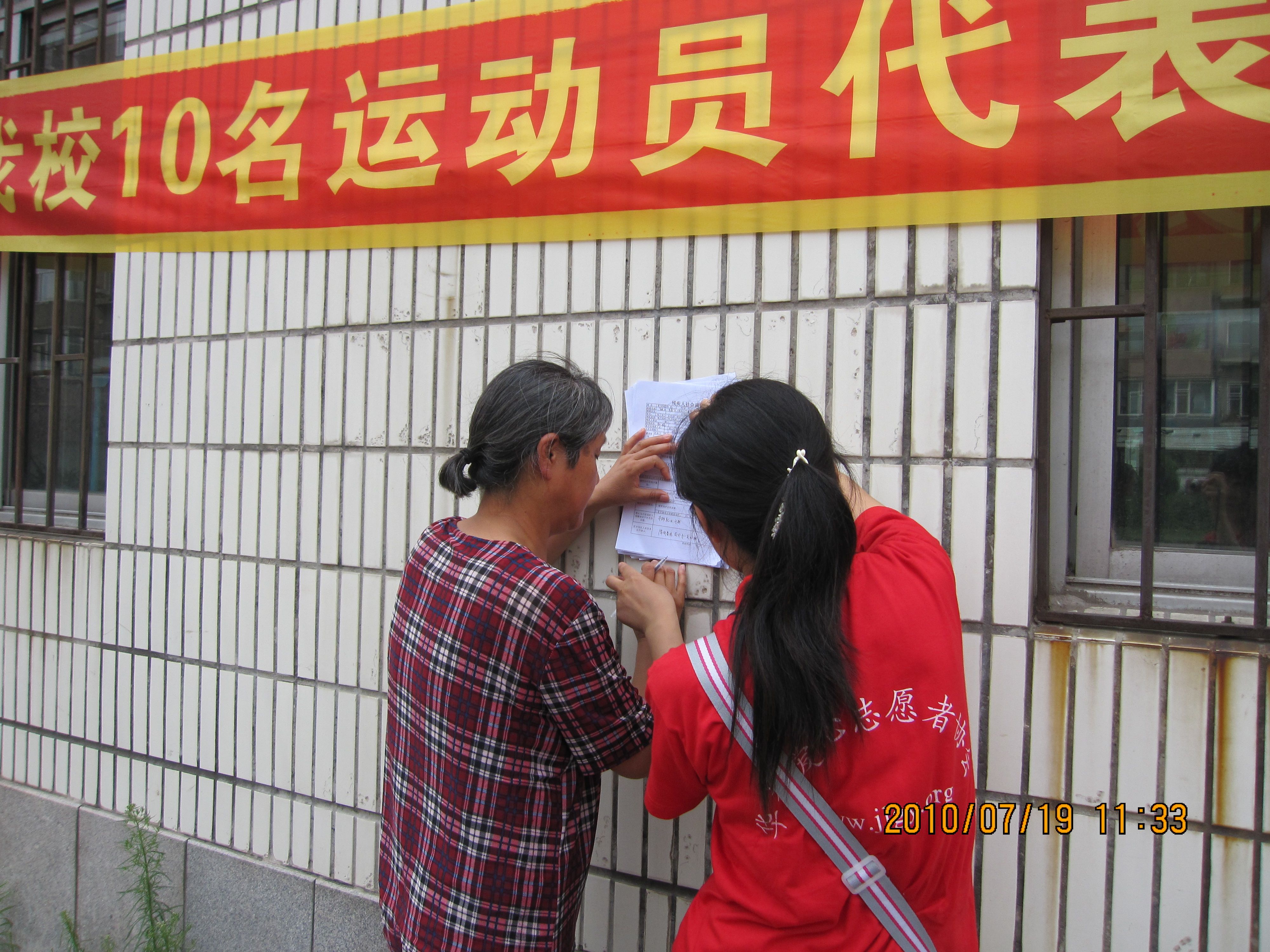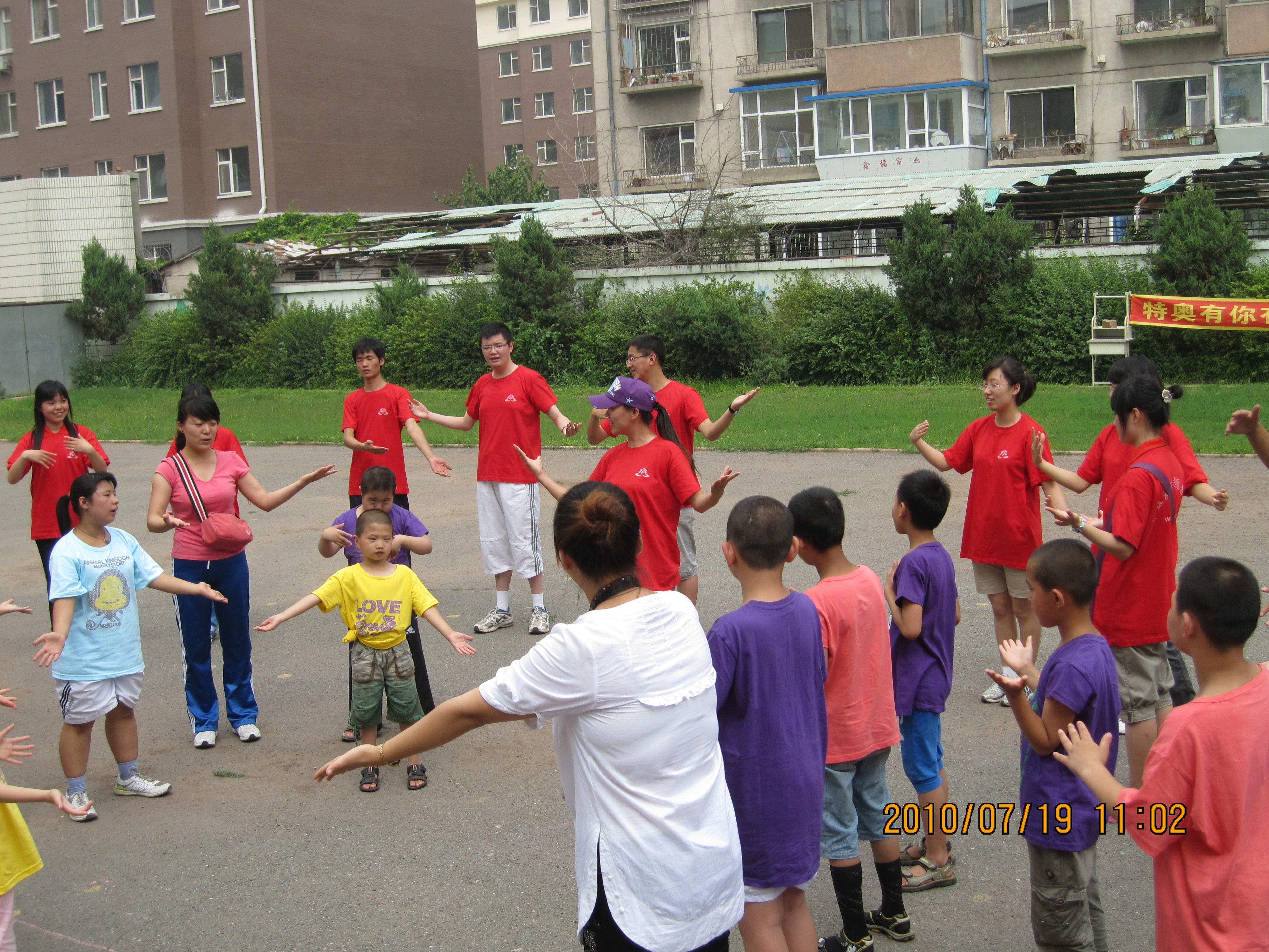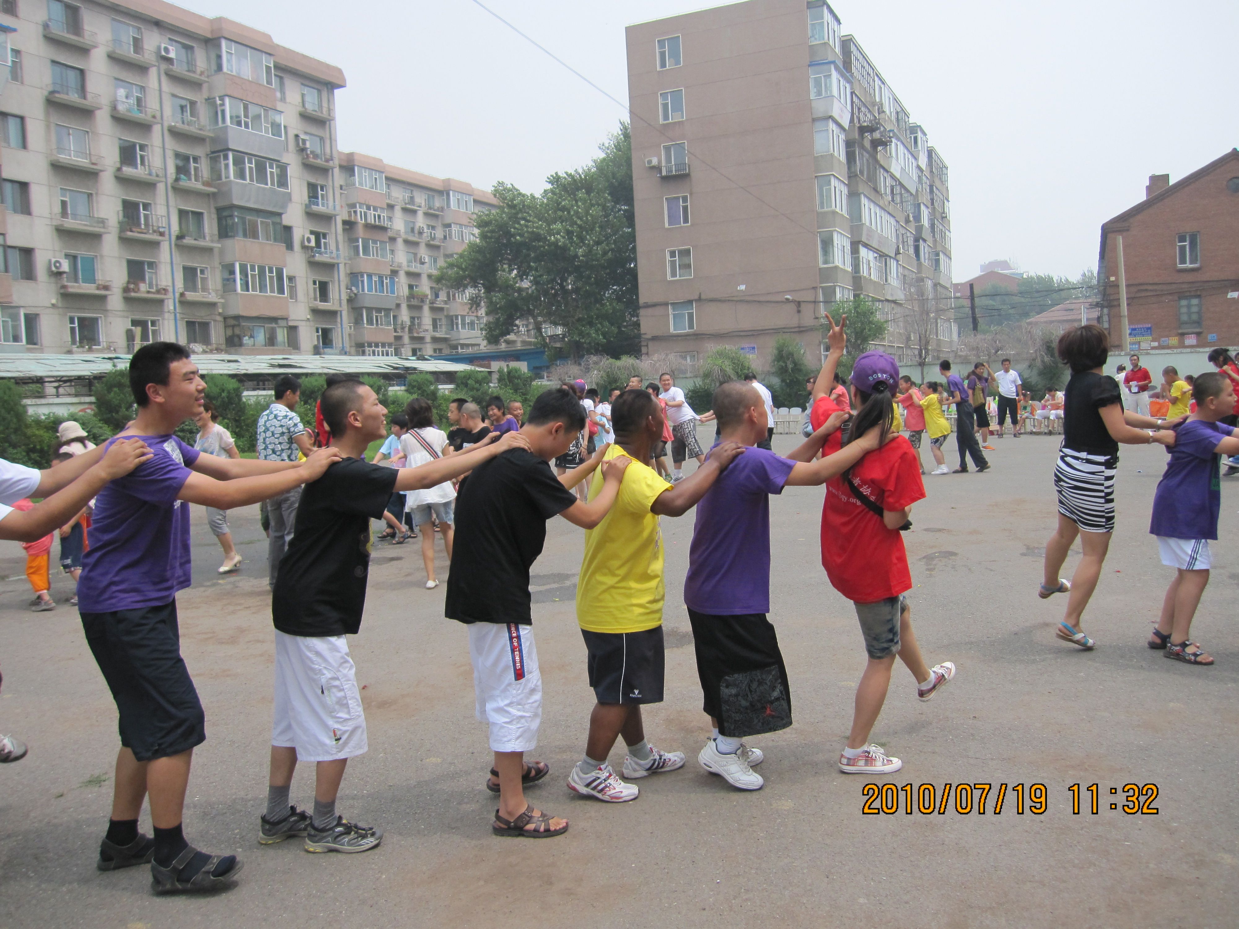 ,搬桌椅、挂条幅、吹气球……紧张而有序的会场布置工作马上展开。志愿者以“责任制”分散到各个年级以及检录组,协助老师照看孩子、帮孩子们换衣服,并引导孩子们进行各项竞技项目,保障孩子们的安全。运球跑、夹气球、吃西瓜、除四害……游戏虽简单,可志愿者却被孩子们的认真与执著和老师慈母般的关爱深深感染。在吃西瓜比赛中,一名大男孩更是不顾裁判的再三提醒,坚持要将西瓜留给身边的老师,纯真笑容中蕴含的那颗纯真的心让人为之动容。在一曲《阳光总在风雨后》的伴随下,志愿者和孩子们来到场地中央,手语互动环节将整个活动推向了高潮。最后,活动在大家齐跳兔子舞中圆满结束,整个校园成了一片欢乐的海洋。