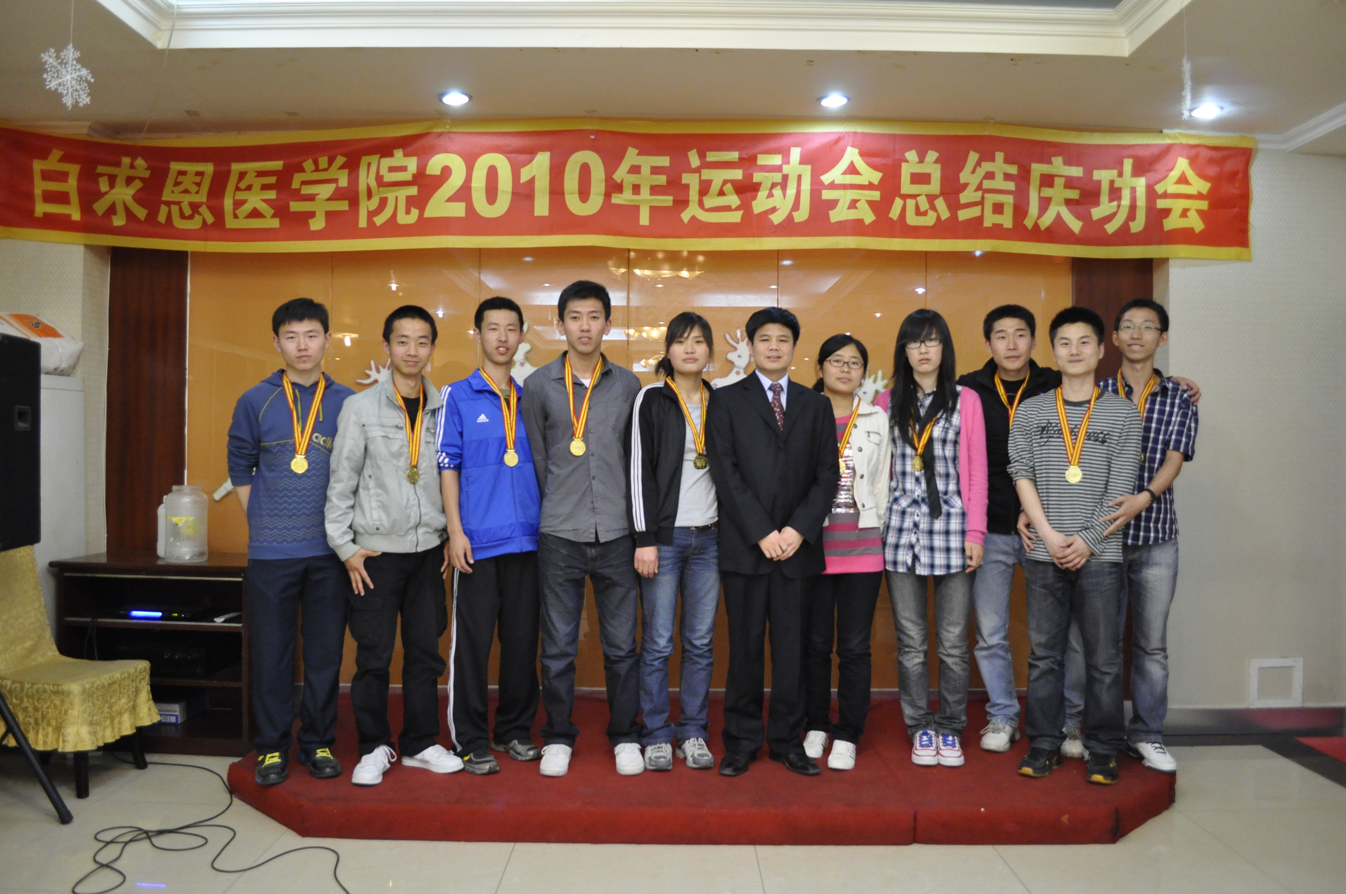 全体运动员、工作人员参加了总结庆功会。会上,党委书记屈英和为获得五四接力长跑冠军的十名运动员颁发金牌,党委副书记苑锐为在运动会各项比赛中获得前八名的运动员颁发证书。