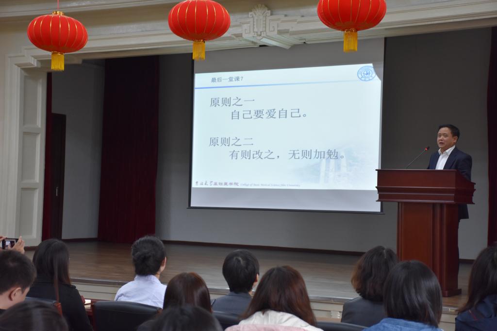 拟毕业研究生学位论文评审过程中出现的问题,提醒大家在论文撰写过程中及时纠正。随后,曹国丽副书就近期工作提出具体要求,用实例分析了端正学习态度、掌握学习方法和提高学习效率的辩证关系,并且反复强调安全问题的重要性,对日常管理和实验室科研中存在的安全隐患进行了详细的说明。最后,孙连坤院长围绕“论文撰写与毕业答辩”做了专题讲座。孙院长结合自身学习与工作经历,分享了科研工作的宝贵心得,督促全体同学在研究生学习期间,学会调整心态,脚踏实地,培养科研思维和科研能力。他指出:医学研究最为复杂,同学们务必要戒骄戒躁,悉心钻研。同时,他还对即将到来的毕业答辩进行了指导,为在座的各位拟毕业研究生答疑解惑。
