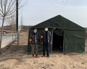 病理学与病理生理学专业2019级硕士研究生刘玲玲(指导教师:孙巍教授),来自江西省赣州市上犹县东山镇高桥村;病理生理学2019级硕士王月明(指导教师:葛敬岩教授),来自甘肃省定西市陇西县柯寨镇张家湾村。为做好新型冠状病毒感染肺炎防控工作,他们放弃难得的寒假休息时间,在各自的家乡做着相同的志愿工作。他们坚守在村子进出路口上、应急救援帐篷边,每日工作十多个小时,呼吁村民戴口罩、勤消毒、少外出、不集会,宣传疫情防护知识,守护父老乡亲健康平安。“疫情防控,人人有责,医务工作者在前线战斗,我们在后方保障普通群众的安全,虽然能做的很少,但我们在尽自己所能让这场无硝烟的战役早点结束。”村民们被他们的言行感动着,为他们送水送食物。研究生志愿者们无私奉献,为群众健康保驾护航,犹如冬日里的一缕暖阳,温暖着每个人的心。