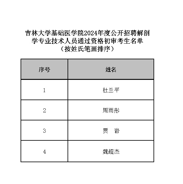 2024年度公开招聘解剖学专业技术人员实施方案》,经资格初审,确定杜兰平等4名考生为通过资格初审人选(具体名单见附件)。