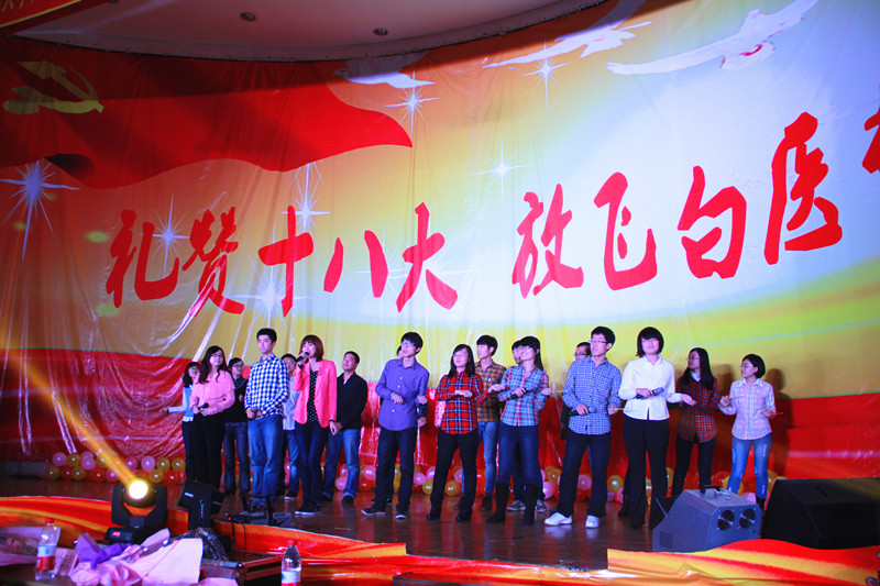 开展的“献礼十八大,躬身实践中”社会实践与志愿服务活动取得的优秀成果,将正常晚会推向高潮。最后,第二届全国大学生基础医学创新论坛暨实验设计大赛的11名获奖选手及2012级各班辅导员助理合唱《爱因为在心中》,温暖了整场,为本次晚会画上了一个完美的句号。