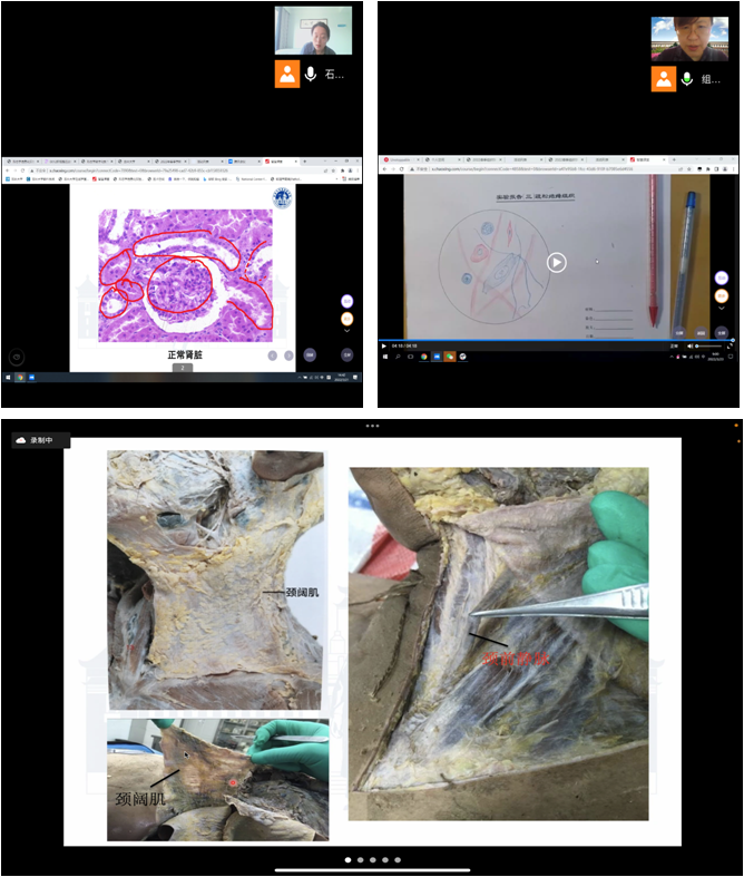 已经开出实验课13门次,授课学生人数达1327人,不同的学系针对课程的特点,动态调整授课方法,确保实验教学高质量的进行。其中,病理学系组织召开了4次教学组培训与研讨,共同探讨了“同步课堂+腾讯会议+学系自建虚拟实践教学平台”的实验课授课新模式,完全实现了线下实验课的线上翻转。组织学与胚胎学系利用形态学虚拟实验教学系统,带领学生跟随老师的目光和讲解,一起观察人体组织的微观结构,并设置线上画图与共享,展示了学生对实验内容的掌握与运用。解剖学系通过超星学习通平台建立了完整的线上教学体系,学系召开网络会议组织全体成员学习直播操作,总结并制作了简化版详细的操作手册,及时调整了教学计划,做好老师在线答疑,取得了较好的教学效果。机能学实验则采用超星学习通+腾讯会议+梦之路虚拟实验平台+QQ群多平台进行教学的模式,课前在超星学习通平台发布课件以及学系前期录制实验操作视频等教学材料供学生学习及预习,课上从超星学习通平台进入腾讯会议进行直播授课,学生在了解实验内容后,在梦之路虚拟实验平台进行操作,有疑问的地方,教师在QQ群里进行答疑,并开展讨论。