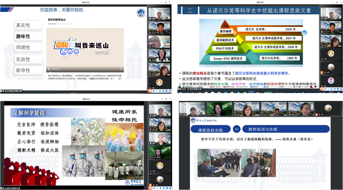 在汇报与分享交流阶段,十位教师结合各系学科特点,向参会的专家和老师们分享了疫情期间课程思政的教学设计与教学效果。病理学系的王医术教授分享了 “疫期《病理学》课程思政的实践与思考”,通过介绍病理学课程蕴含的隐性思政和显性思政,以大爱为基础,以大德为中坚,以大智为核心,实现无声融思政,有声育英才。组织学与胚胎学系刘佳梅教授汇报了“同新战役,同屏共振的思政分享”。通过介绍组织学与胚胎学系通过优化教学内容、创新教学方法、创新考核评价体系,实现了课程思政教学效果的新高度。病理生理学系的苏静教授分享了“基于学生自驱力的思政元素设计策略”,让大家了解到病理生理学课程通过“简”以突出重点、“通”以凸显学生、“推”以强化能力、“拔”以培养卓越,实现了课程思政的无声融入。生理学系的葛敬岩教授分享了“融情入理,潜心育人”,通过介绍生理学系的开学第一课设计,为学生讲授身边的故事和榜样,展开生理学系的教学内容,将思政元素在第一课渗入到全部的课程学习中。药理学系的石卓教授分享了 “坚定信念,实时思政——药理学系课程思政情况汇报”,层层递进、环环相扣的教学设计,为我们展示了药理学课程思政安排的创新与巧妙。免疫学系的付海英老师分享了“无声育人,有声花开——医学免疫学课程思政实践与思考”, 通过介绍思政元素挖掘、思政路径设计、课程思政实施以及思政效果展示,体现了免疫学课程的育人无声、花开有声。生物化学学系的张纪周老师分享了“脚踏实地,思政育人——生物化学课程思政元素挖掘”,生物化学学系以本学期的线上教学抗疫宣讲和教学设计为例,通过真实性、趣味性、同理性、时效性以及新奇性展示了生物化学课程的育人细无声。分子生物学系的王华老师分享了“医学分子生物学课程中思政元素的渗透与融合”,通过介绍分子生物学的学科特点、从科学史中挖掘出课程思政元素以及如何将思政元素与学科特点有机融合,展示了分子生物学课程思政的设计与感悟。解剖系的刘辉老师分享了“追思感恩,责任担当,隐性思政,润物无声”,让我们了解到解剖学作为特殊的一门课程,教师在授课的同时,教会了学生如何尊敬和感恩大体老师,学系在积极投身教学的同时,也努力种好了课程思政责任田。细胞生物学系的何海涛老师分享了“医学细胞生物学课程思政的建设与实践”,通过教学理念、教学策略、教师培训与实践以及教学成果四个方面的介绍,展示了细胞生物学的思政设计。