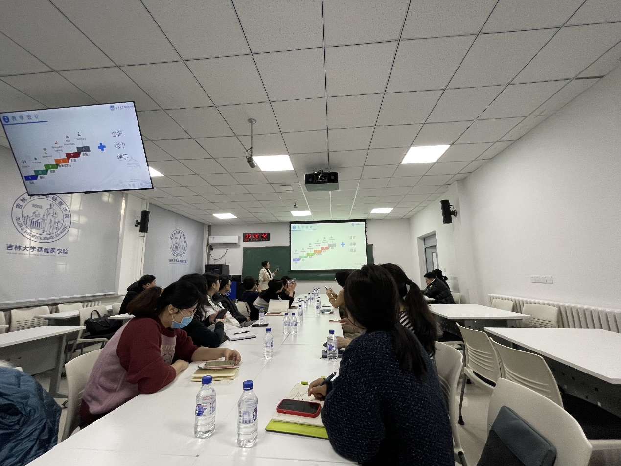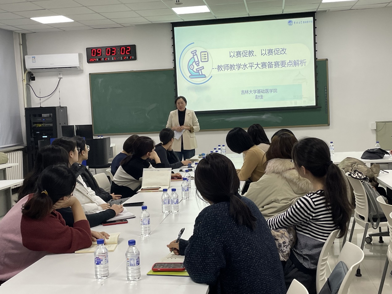 赵佳副教授曾获得第三届全国基础医学青年教师讲课大赛一等奖、吉林省本科高校教学创新大赛二等奖等奖项,她以“以赛促教、以赛促改--教师教学水平大赛备赛要点解析”为题,与参会教师分享了她参赛经验。首先,她对大赛评分要点进行了分析,并从BOPPPS教学模式的导言、目标、前测、参与式学习、后测和总结六个教学环节分享了如何进行课堂教学设计及注意事项。随后,她结合优秀案例讲解了板书设计、教学道具、PPT制作、语言表达等方面的技巧,同时强调了信息化手段的应用以及巧妙融入思政元素的重要性。
