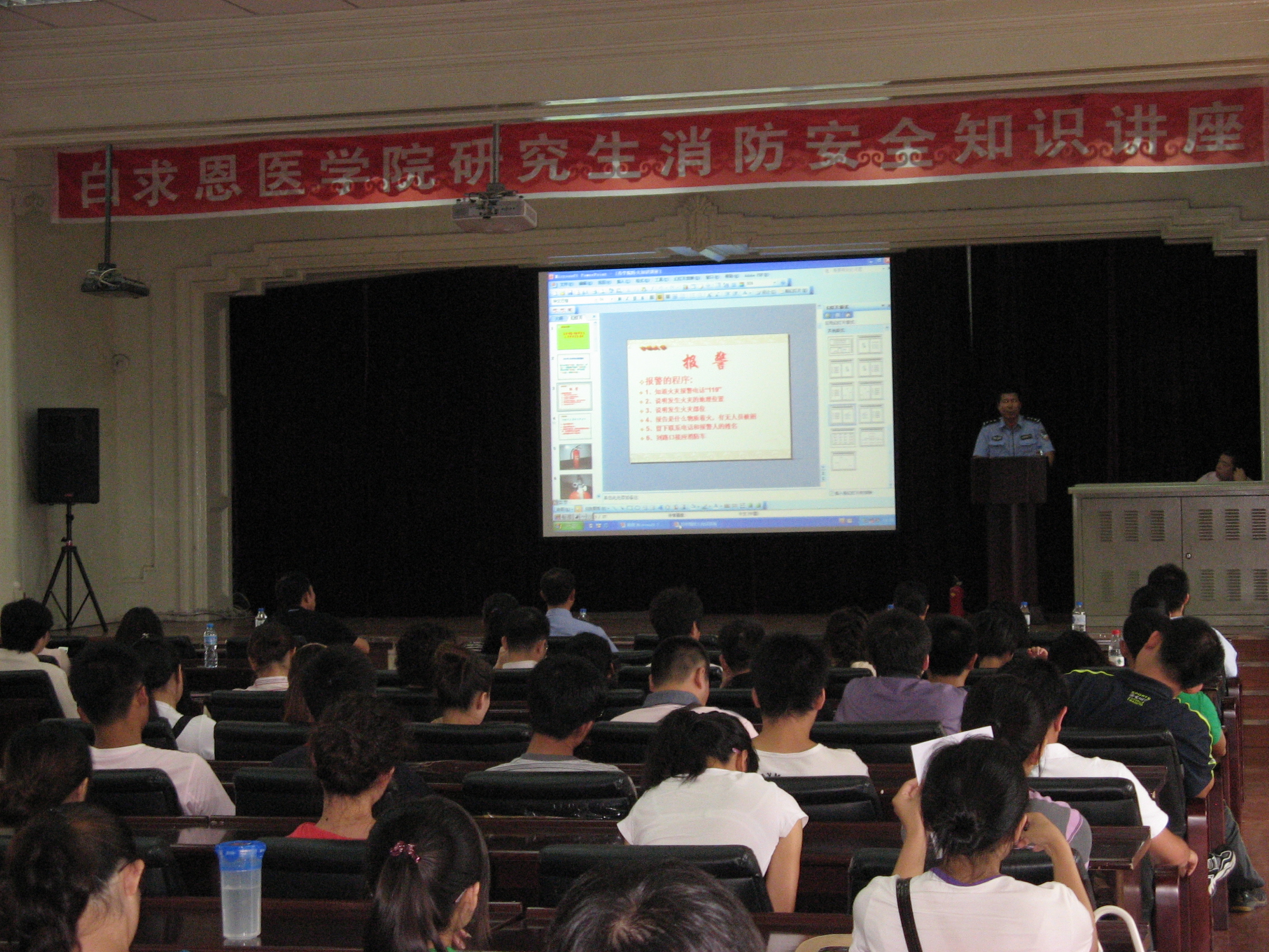 女生宿舍火灾”等案例,图文并茂地向同学们讲述了火灾的严重危害。之后,安科长现场演示了灭火器及消防栓的使用方法,并说明了使用注意事项。最后重点为同学们讲解了发生火灾后如何逃生与自救。郭云秀科长从财产安全、人身安全等方面以鲜活的案例向同学们强调了安全防范的重要性,提醒同学们要注意保管好个人贵重物品,进一步增强人身安全意识。刚入学的研究生们表示,通过保卫办两位老师的精彩讲座,不仅学习了消防安全知识,更增强了消防安全意识。