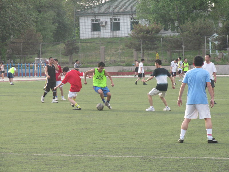 比赛分为博士队和硕士队,随着裁判的一声哨响,双方立即展开激烈的争夺。双方队员在场上左突右攻,积极拼抢、盘带、进攻、退防…颇有职业球员的风范。上半场,博士队率先进入状态,凭借较好的团队技术和个人突破能力以4:0领先上半场。硕士队暂居下风,有几个势在必得的球不是打在门柱或门楣上,就是被博士队的守门员郭亚雄飞身扑救挡出。下半场开始后,硕士队重整旗鼓,积极组织进攻,主力前锋王伟伟凭借一记角度刁钻的射门使得硕士队将比分扳回一分。场外观众愈发多了起来,加油声、叫好声不绝于耳,观众的热情鼓舞了球场上的每一位球员,他们在场上更加活跃、更加兴奋。最后,博士队的队员通过奋力拼搏,通力合作,抵挡住了硕士队的猛烈攻击,最终以4:2战胜了硕士队。