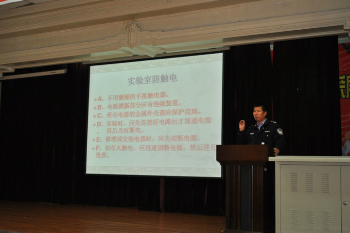 安科长给同学们详细讲解了火灾发生的主观因素,并从火灾的突发性、严重性、复杂性等方面介绍了火灾的严重后果。同时详尽的阐述了防火的主要措施以及科学灭火的主要方法。他重点强调了实验室安全问题,提醒同学们面对实验室里存放的爆炸物品、易燃物品和腐蚀品等化学危险品,一定要保证存放位置安全,并按照要求规范使用。最后,他从治安方面强调了同学们要注意交通安全、寝室安全以及教室安全等。